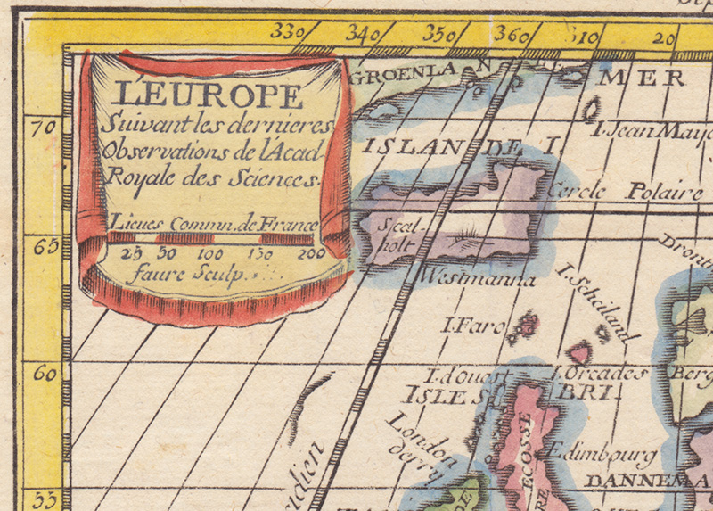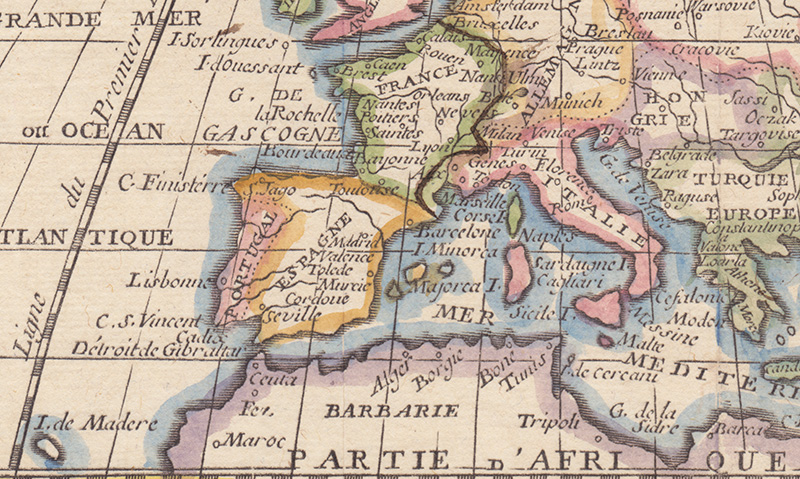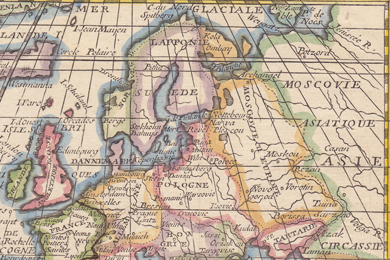 Что касается восточной части, то, вероятно, этим местам было уделено меньше внимания. Во всяком случае, российско-польская граница уже лет 70 как была сдвинута на запад, и Киев уже был выкуплен у Польши, став частью России. Удивительны очертания Крыма: пожалуй, это одна из немногих карт, где полуостров обозначен весьма причудливо, практически неузнаваемо. Обычно европейские картографы вырисовывали его довольно тщательно, подписывая все известные им города. А вот граница Франции с Италией и Германией подкрашена особенно чётко. За Средиземным морем живут варвары, а восточнее Москвы известна только Казань. Карту можно долго разглядывать, вчитываясь в надписи, сделанные четким и красивым шрифтом. Карта не только интересна, но она при этом очень привлекательна.