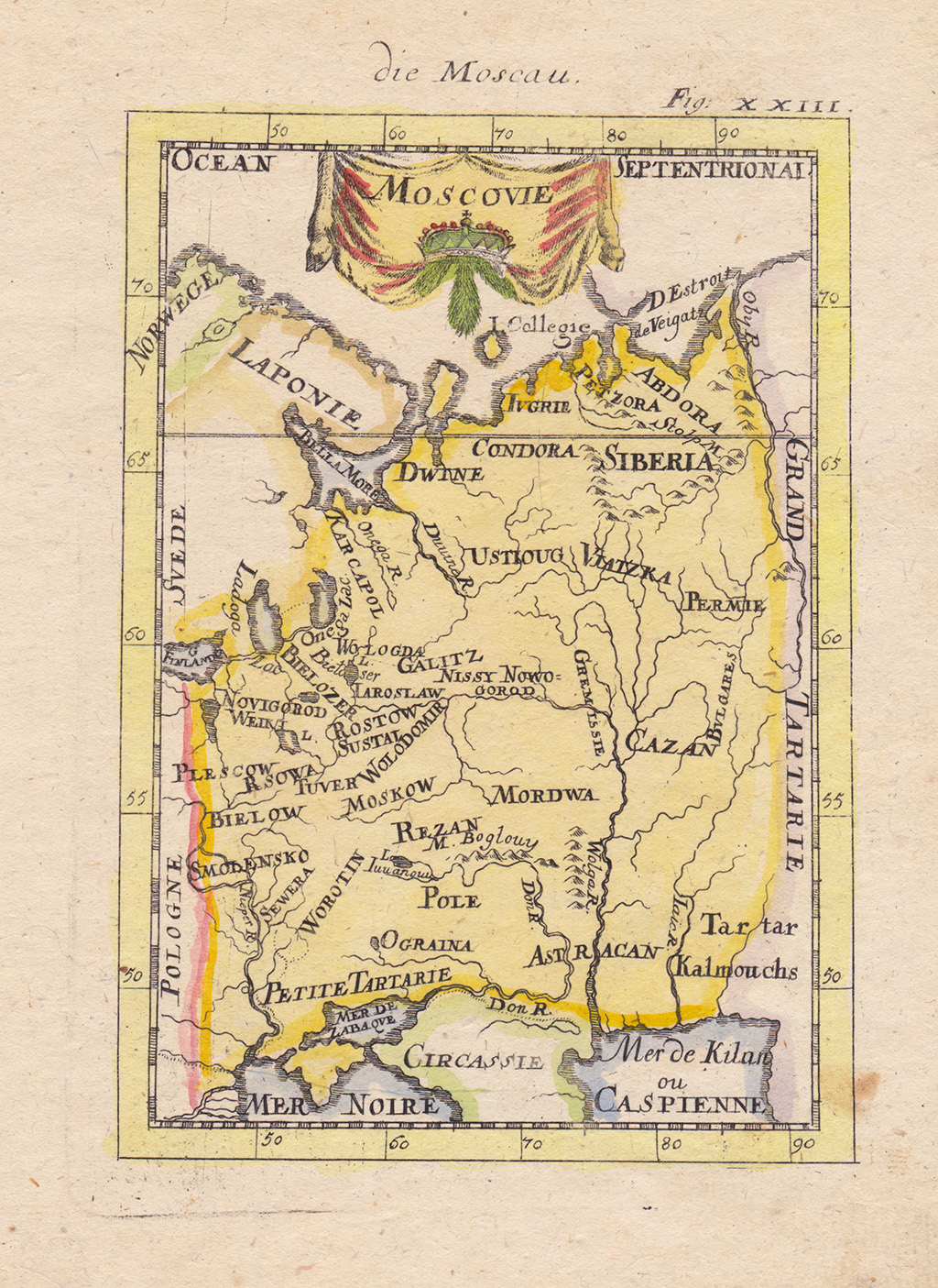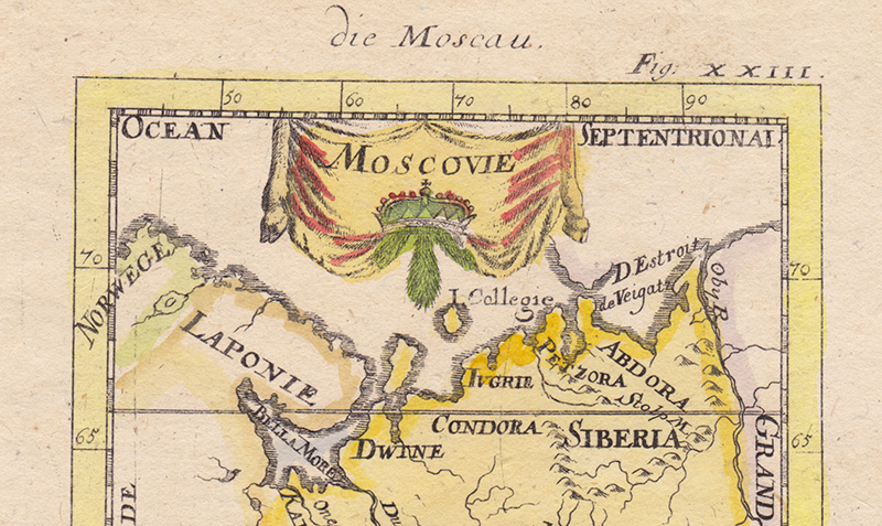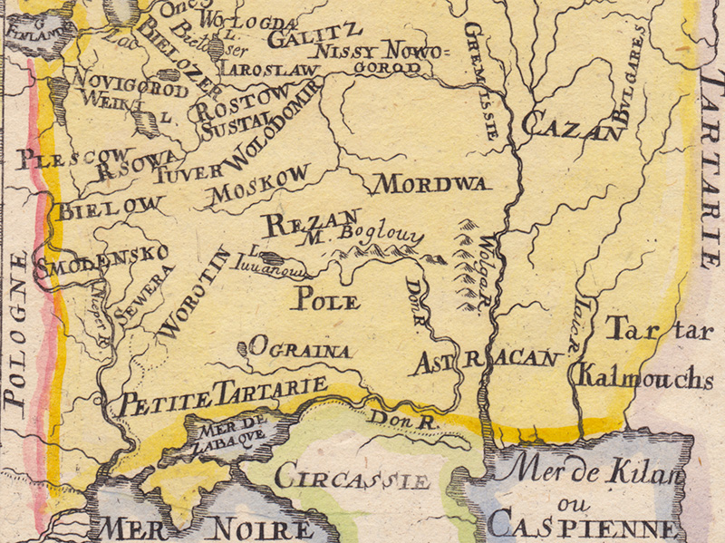 На карте нет точных отметок городов Московии, но указаны многочисленные земли и княжества (например, Worotin – Воротынское княжество, Bielow – княжество Белая, Rezan – Рязанское княжество). Рядом с Малой Тартарией и Крымом расположена Ograina, на северо-западе – Лапландия (Laponie), южным соседом являются Черкассы, занимающие на карте всю территорию между Черным и Каспийскими морями, на востоке – Великая Тартария, на западе – Польша и Швеция. Это одна из последних карт, изображающих Россию в виде отдельных земель и раздробленных княжеств.