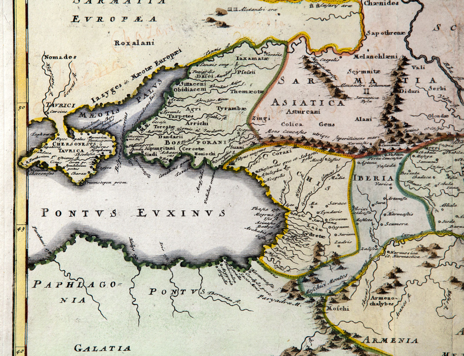 Череда легенд, мифов и сказаний сопутствует указанным на карте городам, а каждый из них - это национальная гордость своего народа: Panticapaeum (Пантикапей – современная Керчь), Theodosia (Феодосия), Pityus Magnus (Пицунда), Phasis (Фасис, теперь это город Поти), Trapezus (Трапезунд/Трабзон).