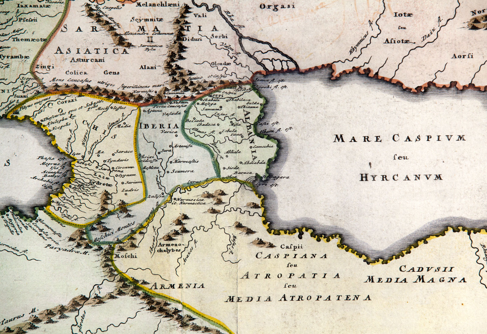 Тщательно прорисованные Кавказские горы интересны аккуратно вычерченными в них проходами-ущельями: Кавказскими воротами и Каспийскими воротами.