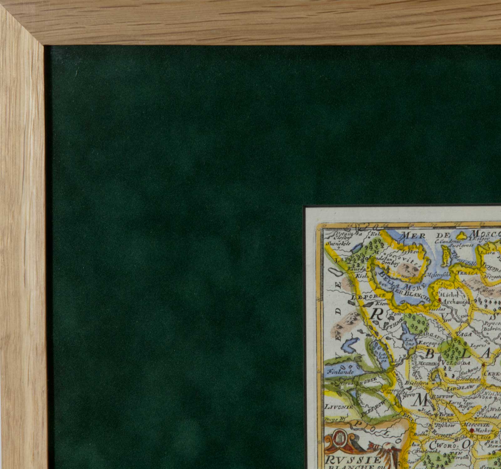 красивый бархат тёмно-зелёного цвета, с чёрным срезом. Классический цвет бархата прекрасно оттеняет акварельную подкраску карты, а тонированный чёрный срез подчёркивает элегантность карты, придаёт ей строгость и позволяет увидеть следы времени - отпечатки краёв медной пластины.