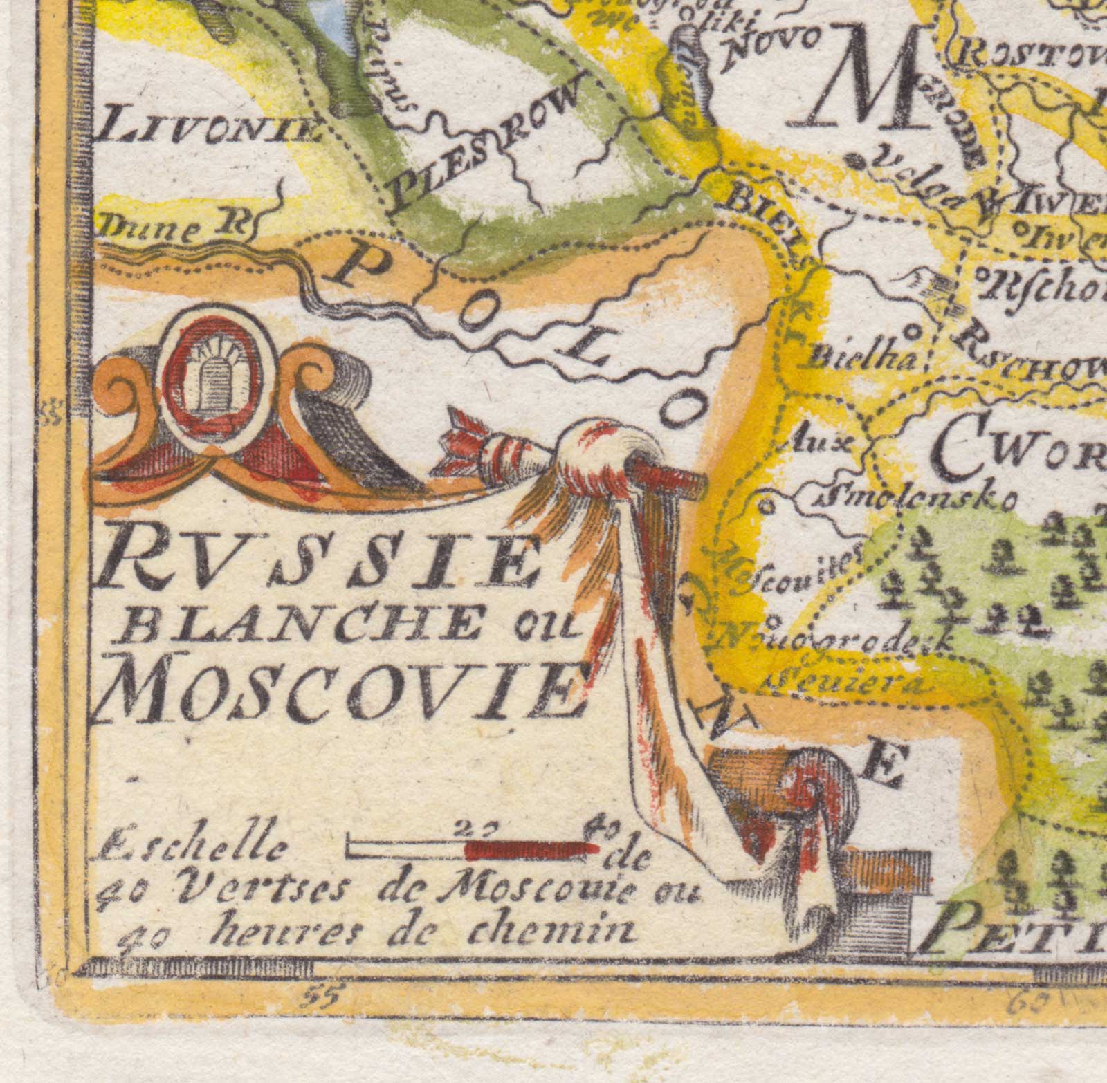 В левом нижнем углу карты помещен картуш с полным названием карты и шкалой, которая отмеряет расстояние вёрстами: «40 вёрст до Московии или 40 часов пути». Таким образом, Москва на карте является как бы точкой отсчета расстояний до других городов Русского царства.