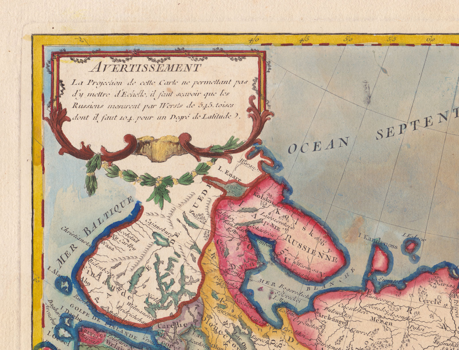 Карта с изящным раскрашенным вручную картушем. В картуш вставлен царский герб, перевёрнутый согласно европейским геральдическим канонам. Долгое время в России всадник с копьём использовался как общегосударственный символ, заимствованный у московских князей. На всех старинных государственных документах и печатях русские мастера изображали фигуру всадника так, чтобы оружие, поражающее дракона, было в правой руке, и его было видно. А в Западной Европе по правилам геральдики фигуры на гербах должны быть повернуты влево.