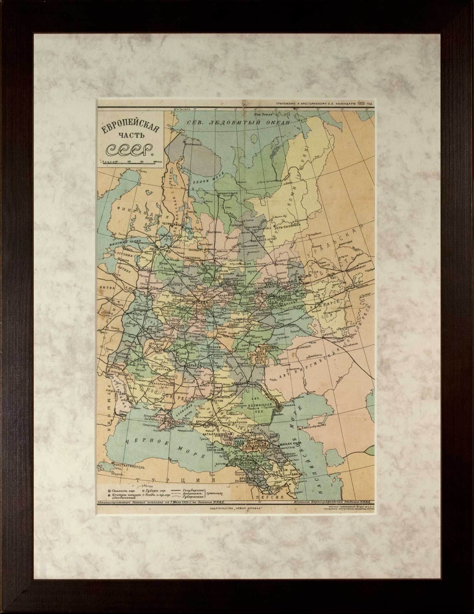 Карта обрамлена в деревянную раму темного цвета, оформлена в паспарту из картона консервационного качества.