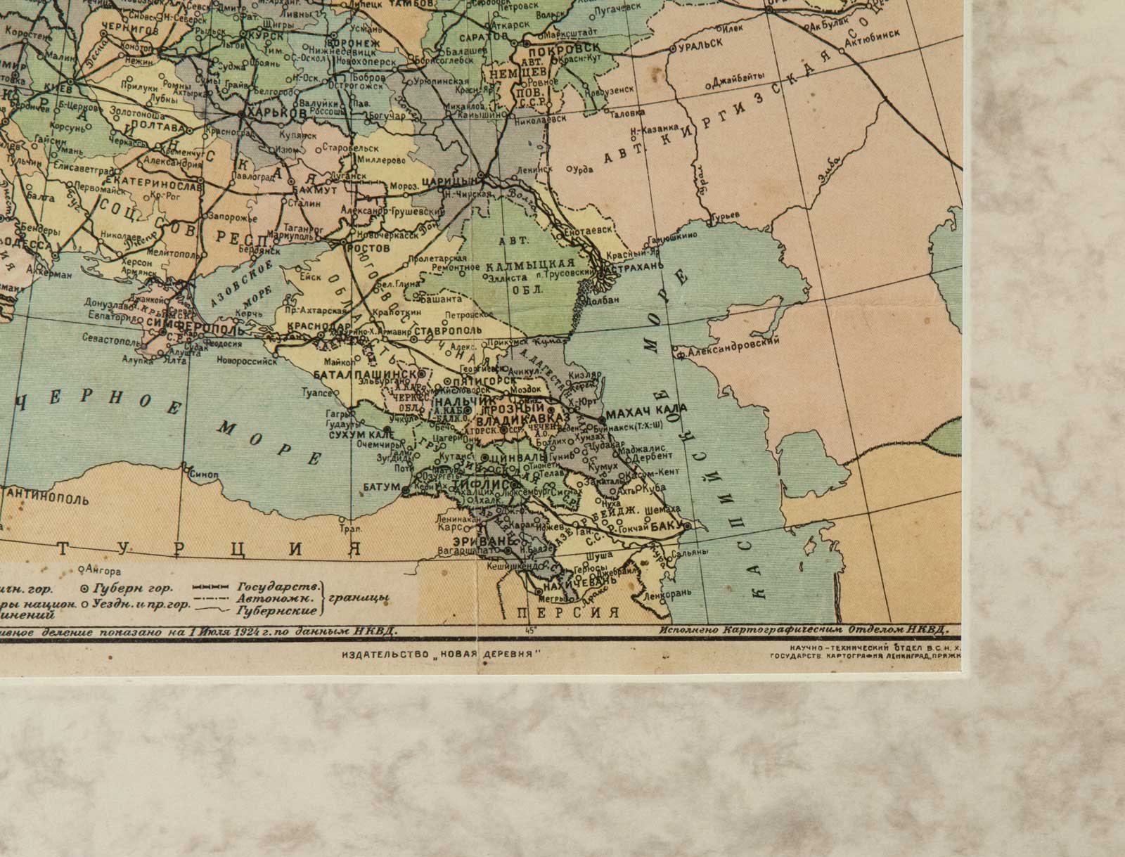 Эта карта - прекрасный подарок родителям и людям старшего поколения, которым близки именно те названия, которые указаны на карте, названия из нашего общего прошлого. На карте показано административное деление на 1 июля 1924 года по данным НКВД. Информация об этом присутствует по нижнему полю карты. Указаны столицы республик, губернские и уездные города, а также центры национальных объединений: Симферополь, Нальчик, Покровск, Казань, Ижевск и др.. Карта относится к интереснейшему времени в истории России-СССР. На карте еще есть Константинополь, но уже и есть город Сталин. Есть Екатеринбург - в одноименной губернии, который в конце 1924 года был уже переименован в Свердловск. Можно найти Александровск-Грушевский в Ростовской области, однако к тому времени город уже назывался Шахты. Вероятно, на карте можно найти и другие историко-географические странности. Возможно, это оплошность и спешка при подготовке к печати, а может быть сознательное внесение не всех изменений в карту. Но так или иначе, карта, выпущенная под грифом "строгой" организации, является весьма не строгой в части географических наименований своего времени. Союзные и автономные республики еще называются "Социалистическими Советскими" (а не наоборот). Правая часть карты отведена Уральской области, где наряду с большими и известными городами (Челябинск и Екатеринбург) можно увидеть небольшое село Аргаяш, в котором на тот момент было чуть более сотни дворов и 500-600 человек населения. Однако, село обозначено на карте, так как являлось центром Аргаяшского кантона Башкирской АССР, представлявшего собой анклав внутри огромной Уральской области. Интересна карта в том числе написанием некоторых городов, которые мы сейчас знаем под теми же названиями, но с другим написанием (например, Эллиста, Эривань, Сухум Кале).