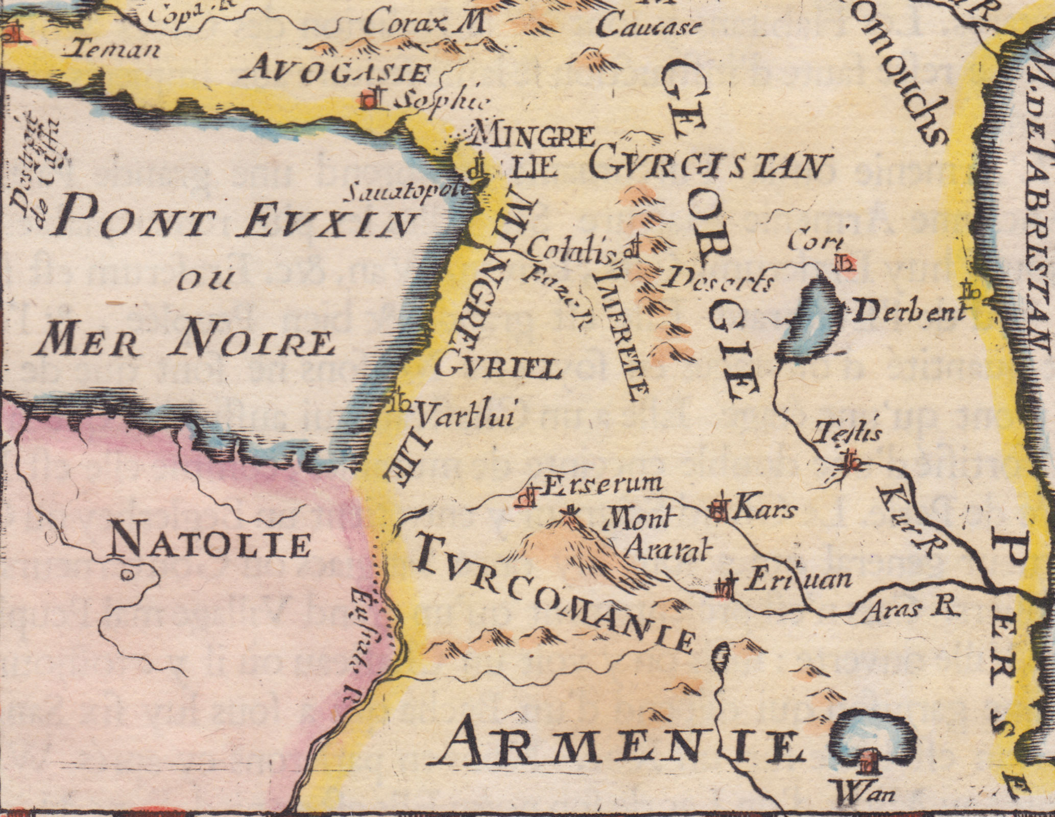 Ориентация карты несколько отличается от привычной нам, но всё же легко находятся знакомые названия: Ереван, Тифлис, Гори, Кутаиси, Дербент, гора Арарат, река Дон. Для тех, кто испытывает имперскую ностальгию, добавим, что граница Российской империи с Персией проходила по хорошо заметной на карте реке Аракс (Aras).