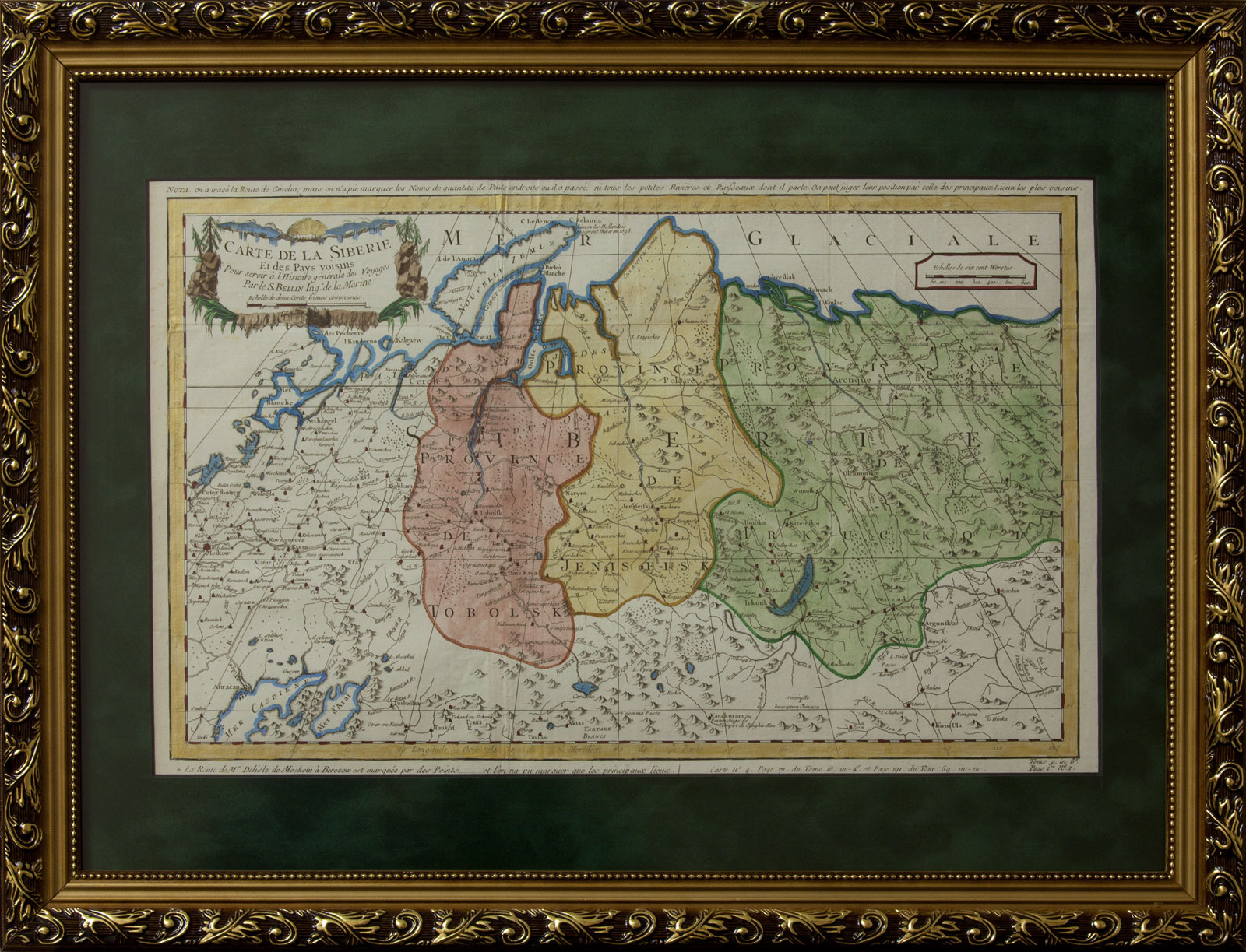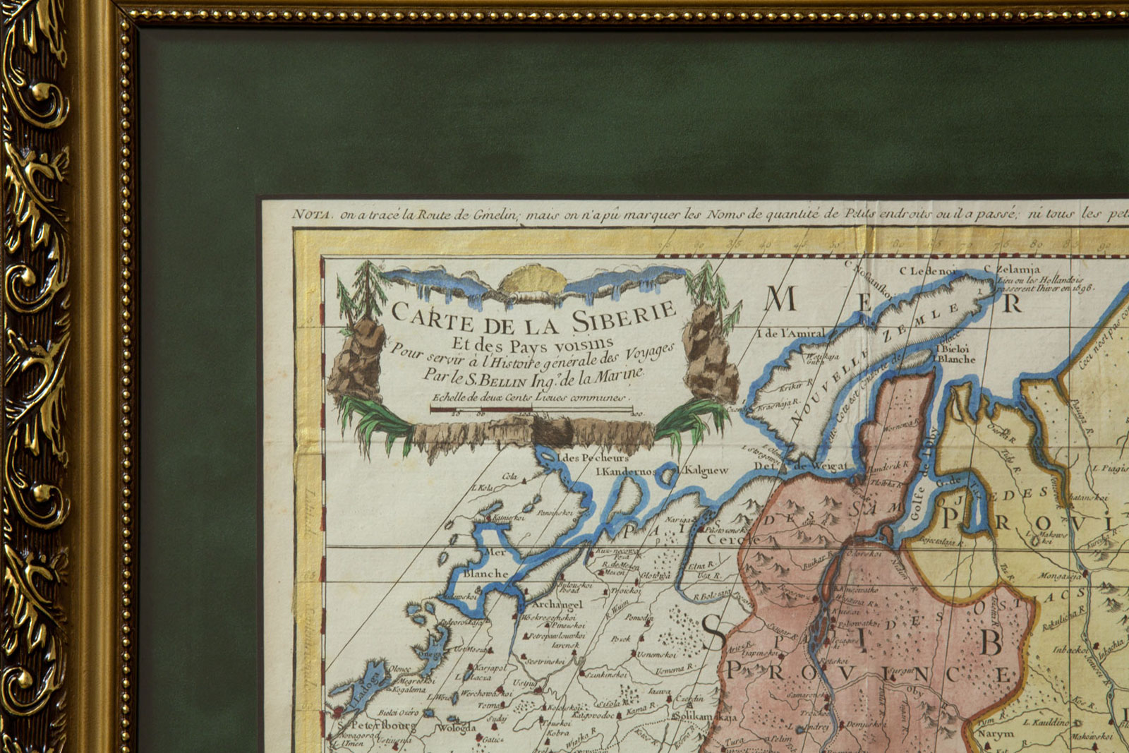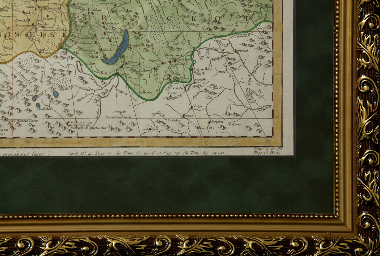 Коллекционная сохранность. Бумага плотная, хорошо сохранившаяся, с явно выраженной сеткой линий, присущей бумаге верже. На бумаге присутствует филигрань. Чуть заметные следы времени – линии перегиба на карте, свойственные старинным книжным изданиям. Карта оформлена в паспарту музейного качества. Материал паспарту – очень красивый музейный бархат классического тёмно-зелёного цвета, с чёрным срезом. Карта обрамлена в деревянный багет с золотистым узором классического вида. Оборотная сторона рамы снабжена подвесом из проволоки с прозрачным пластиковым покрытием, приятным на ощупь. Все использованные для оформления этой карты материалы – бескислотные, самого высокого качества (музейного и консервационного).