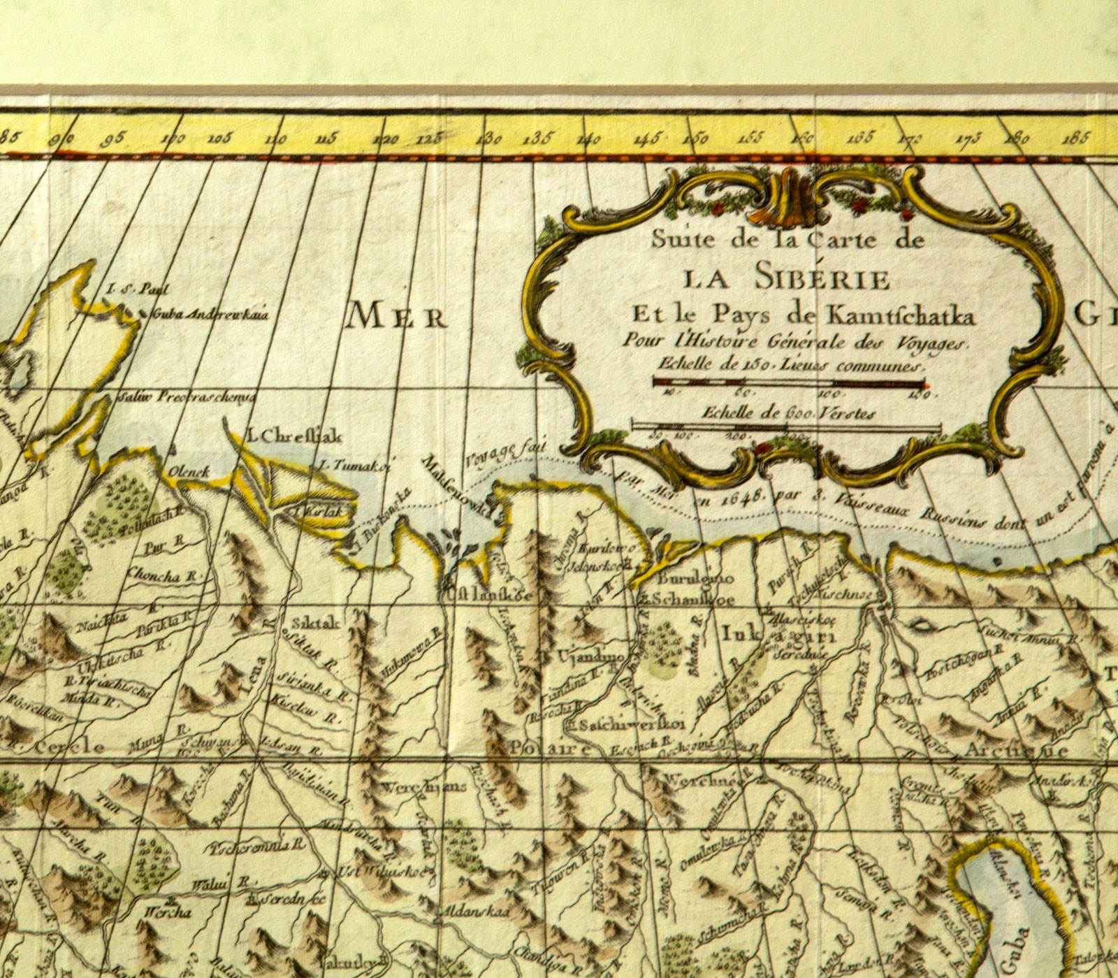 В верхней части карты указан путь экспедиции Семёна Дежнёва и Федота Попова, которые в 1648 году прошли морем вдоль северо-восточных берегов и открыли пролив между Евразией и Америкой. Их открытие на долгие 80 лет затерялось в пыльных архивах Тобольска – центра Сибирской губернии, пока отчёт об экспедиции не был обнаружен в ходе подготовки к Великой Северной экспедиции Беринга.