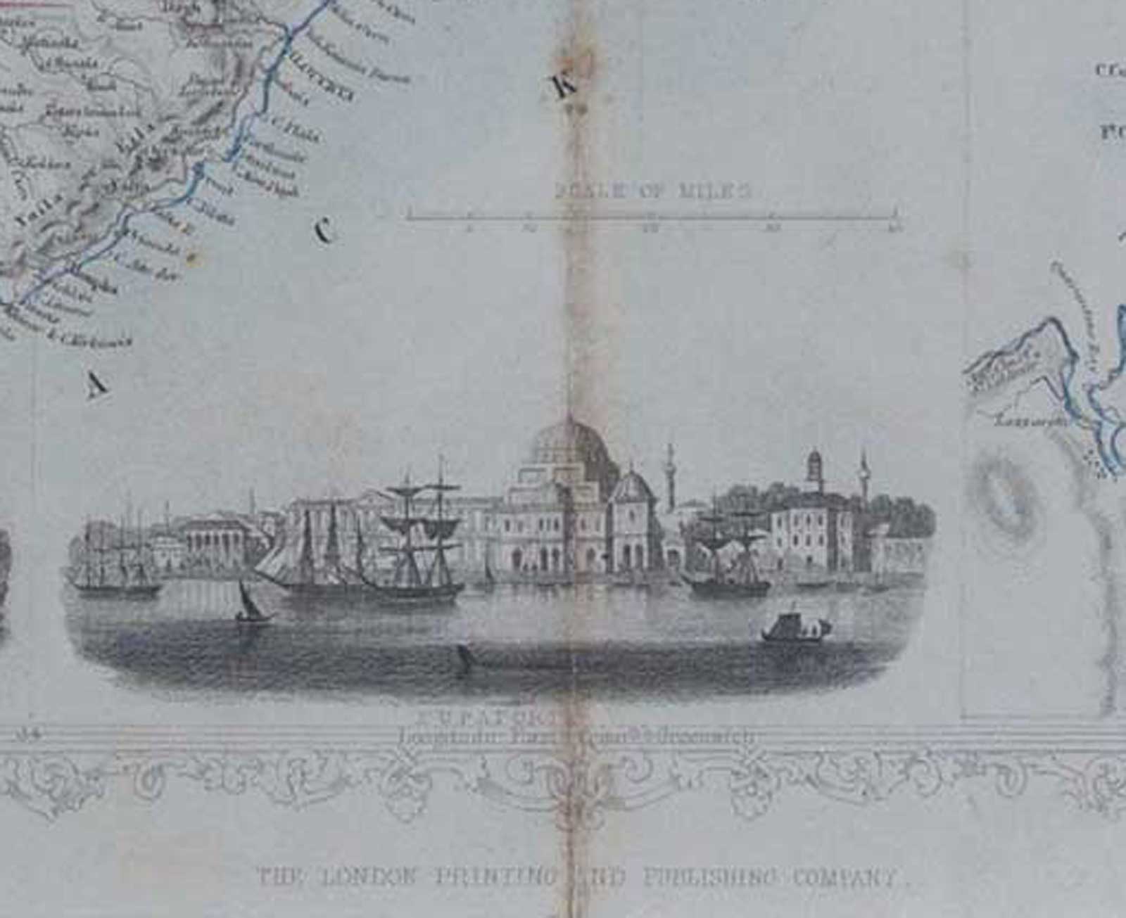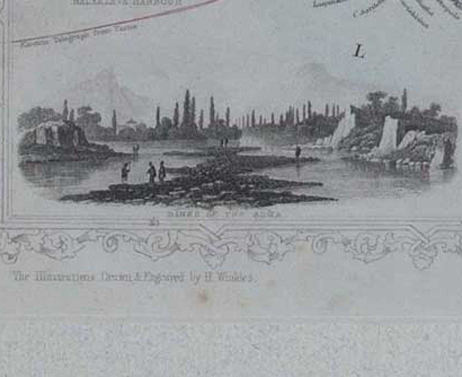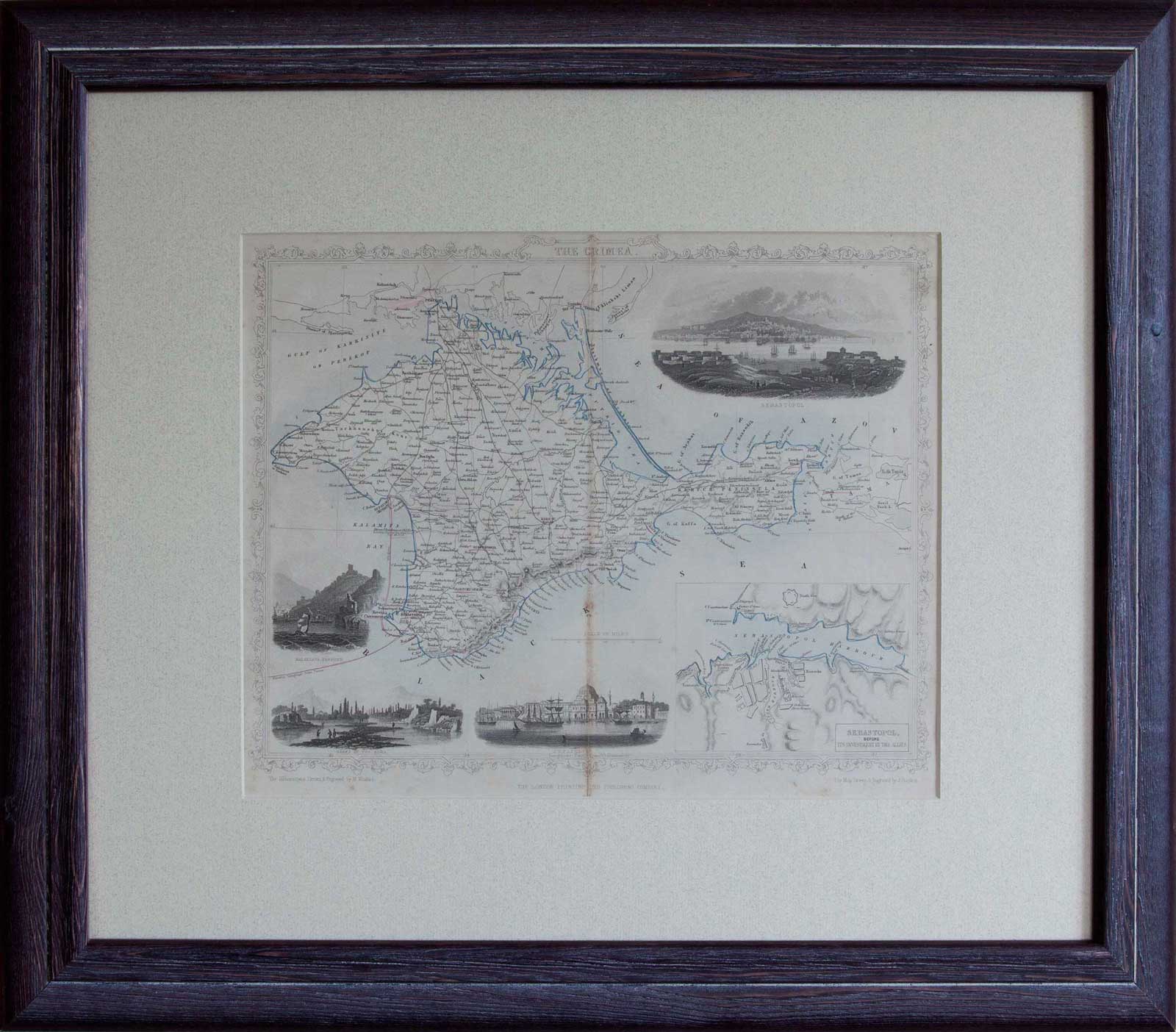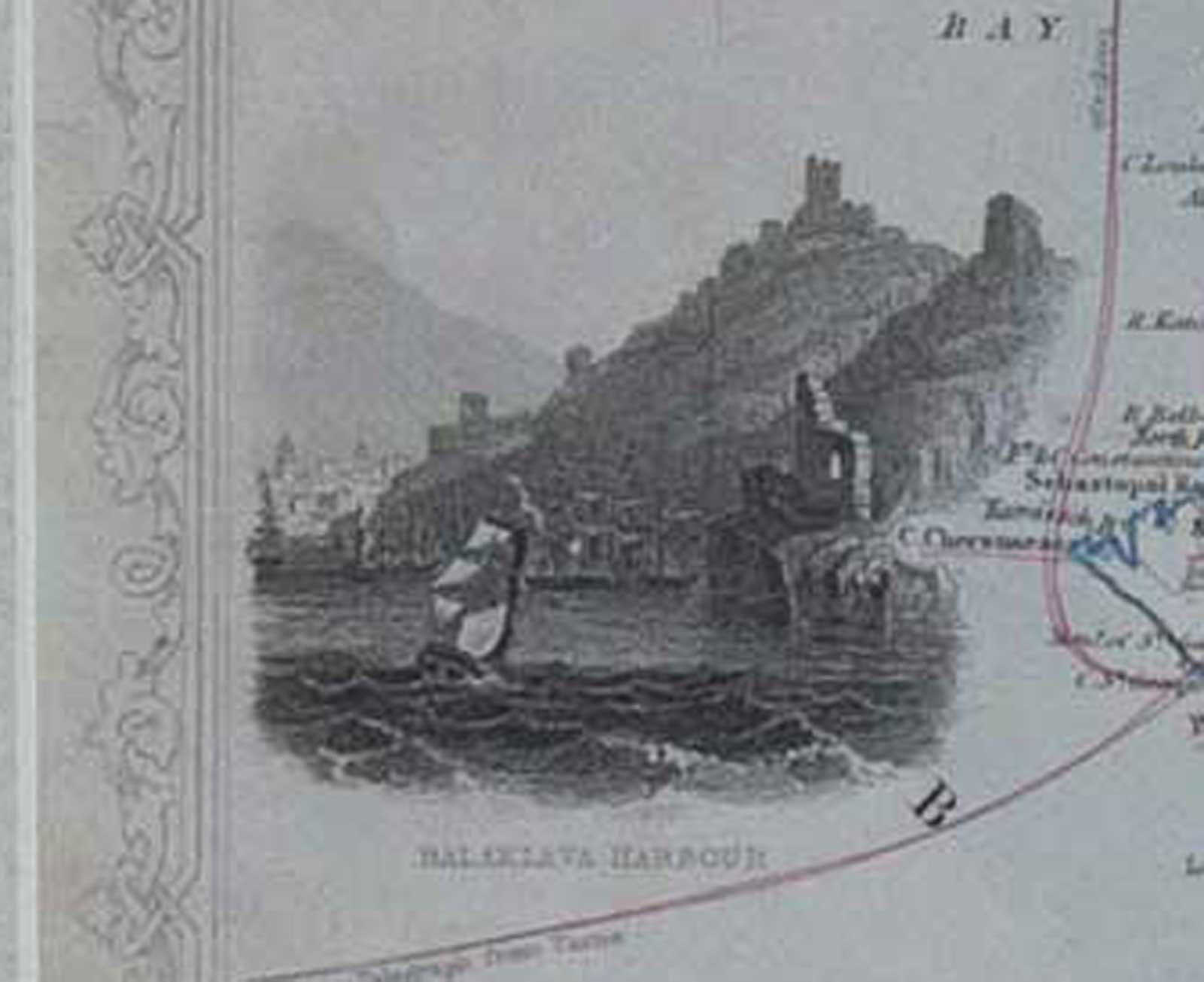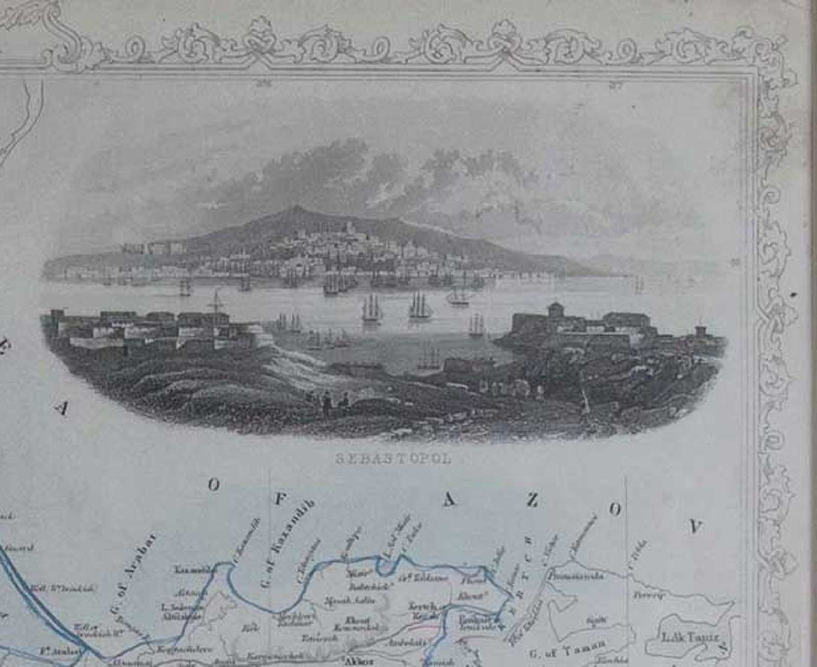 Иллюстрации-гравюры на полях карты созданы английским мастером архитектурной иллюстрации Генри Винкльзом (Henry Winkles), основавшим в Германии первую граверную мастерскую для создания гравюр на стали. В рамку-виньетку сверху вписан аккуратный картуш с названием карты. В правой нижней части карты вставка - план города Севастополя до входа в него союзнических войск Великобритании, Франции и Турции в период Крымской войны. На этом плане обозначен не столько сам город и его жилая часть, сколько военно-стратегические объекты: доки, бараки для войск, форты с указанием количества орудий, госпиталь, телеграф, другие специальные объекты. Из-за очень привлекательного декоративного оформления карт, печатаемых издательством Таллиса, иногда его карты называют последним оплотом английской декоративной картографии XIX века.