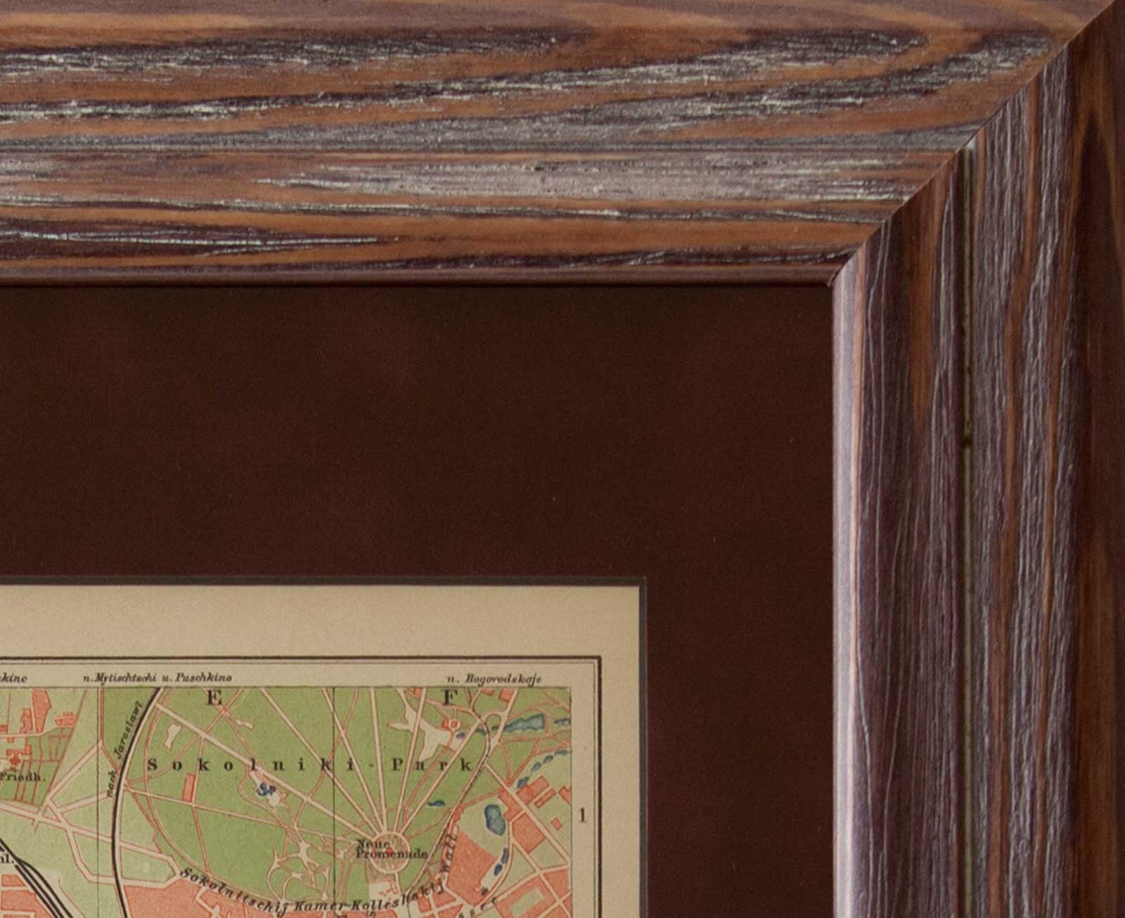 Материал паспарту – темно-вишневый бархат с черным срезом. Карта обрамлена в деревянную раму под стекло. Оборотная сторона рамы снабжена подвесом из проволоки с прозрачным пластиковым покрытием, приятным на ощупь. Все использованные для оформления этой антикварной гравюры материалы – бескислотные, самого высокого качества (музейного и консервационного).
