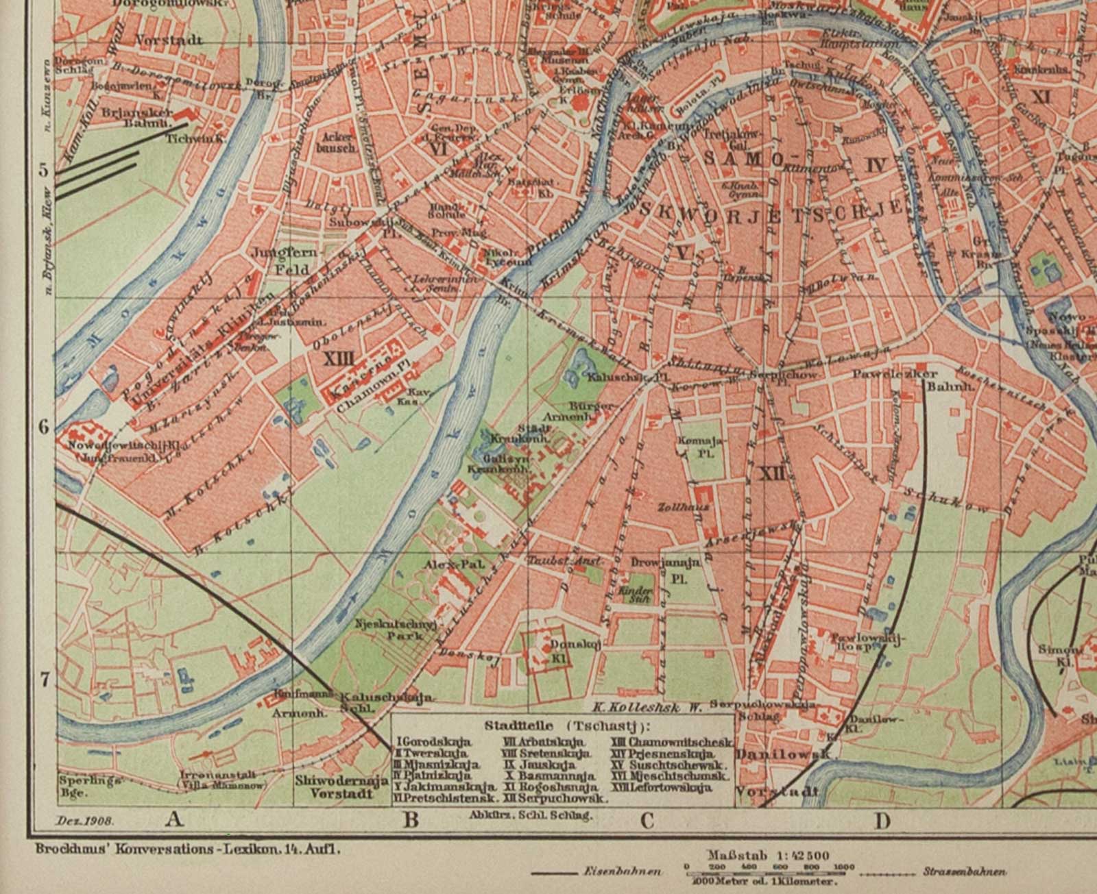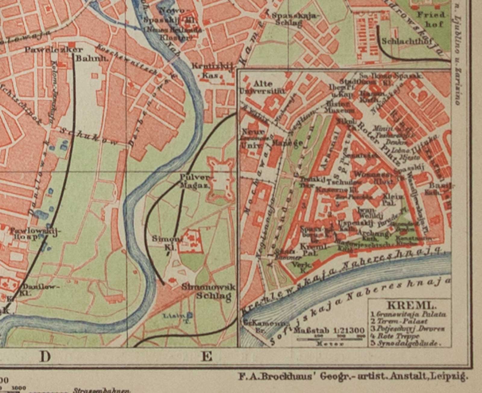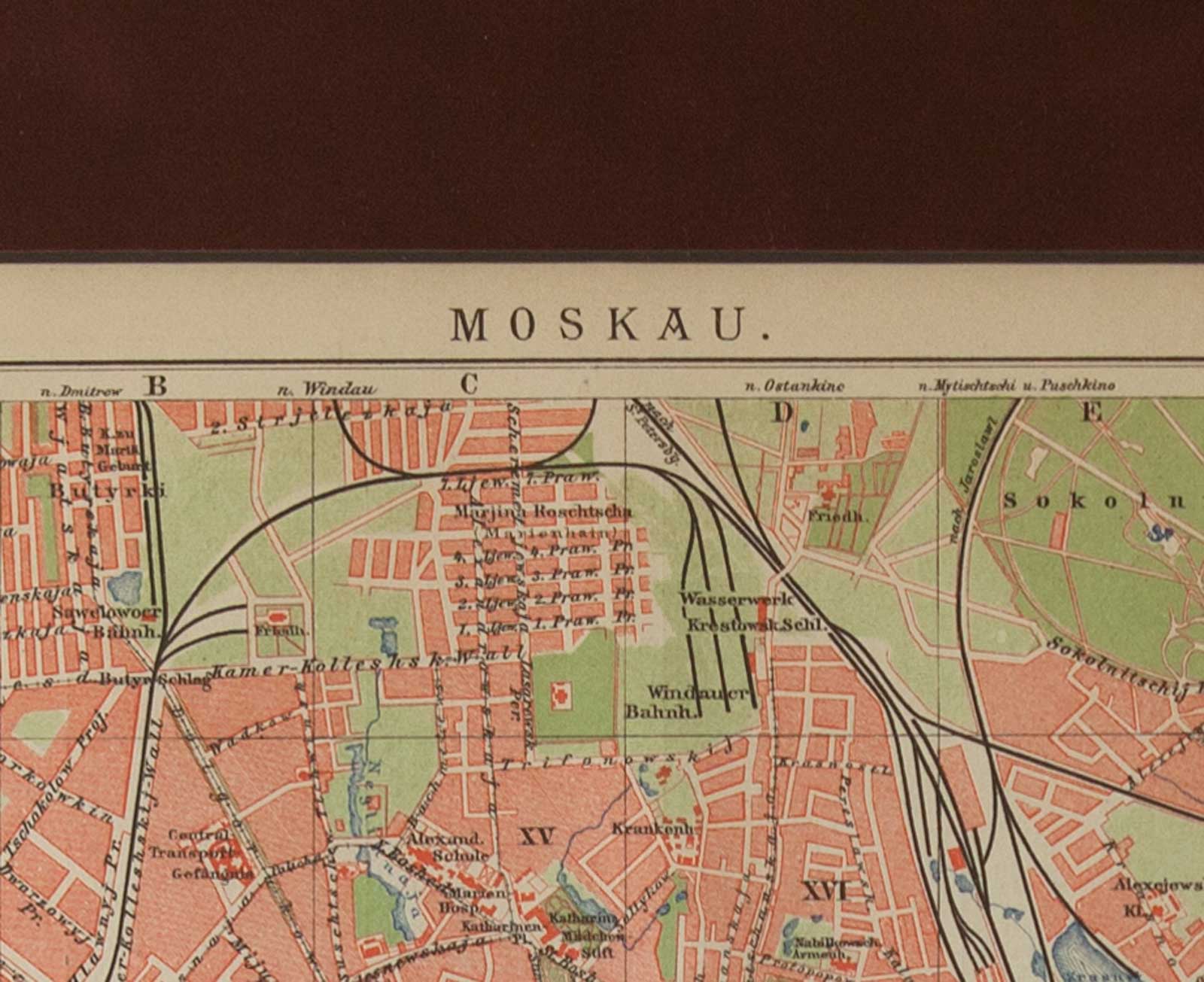 Дата печати карты указана в левом нижнем углу – 1908 год. Масштаб карты 1 : 42 500. Эту старую карту Москвы можно разглядывать часами. Москва за минувшие почти 110 лет уже очень сильно изменилась, вобрала в себя окраины, срослась со многими селами и деревнями, приблизилась к Подмосковным городам и сменила много городских названий. Но при этом Москва абсолютно узнаваема, особенно в центральной части. Тем карта и интересна: она уже достаточно старая чтобы вызывать историко-исследовательское любопытство, сравнивая «как было» и «как сейчас», но еще не настолько древняя чтобы производить впечатление совсем незнакомого города. В левой части карты можно увидеть прежнее название Киевского вокзала – Брянский вокзал, чуть выше – утраченную ныне вследствие современного строительства усадьбу Студенец (Datscha Studenez). В правом верхнем углу, рядом с Ярославским и Казанским вокзалом, там, где и ожидаешь его увидеть, – Николаевский вокзал. Зато совсем не ожидаешь увидеть там никакого водоёма, а между тем, внушительных размеров Красный пруд изображен рядом с Ярославским вокзалом. Какова его судьба? Известный по летописям с 1423 года как Великий пруд, он позже получил новое имя по расположенному рядом Красному селу, использовался для слива нечистот, и в итоге в 1910 году был засыпан, оставив память о себе на старых картах и в топографических названиях – Краснопрудная улица, Краснопрудный переулок, Большой Краснопрудный тупик (протяженностью 160 м) и Малый Краснопрудный тупик (200 м). Среди тех исторических и топографических особенностей, которые мы не найдем на современных картах, можно назвать Камер-Коллежский вал. Он был учреждён в 1742 году как таможенная граница, с 1806 года официальная полицейская граница Москвы, а с 1864 года — граница между городом Москвой, которым управляла Московская Городская Дума, и Московским уездом, которым управляло Земство. К моменту печати карты вал был уже срыт, однако название его на карте немецких картографов все еще присутствует. В наши дни о Камер-Коллежском вале напоминают сохранившиеся некоторые названия его участков, ставшие улицами: Сущевский вал, Грузинский вал, Трёхгорный вал, Сокольнический вал, Бутырский вал и др. Кстати, улица Пресненский Вал до 1922 года носила название Улица Пресненский Камер-Коллежский Вал. А входившие в состав Камер-Коллежского вала заставы тоже частично сохранили память о себе в виде площадей: Площадь Серпуховская Застава, Площадь Тверская Застава, Площадь Сокольническая Застава и пр. На карте обозначены трамвайные линии и железнодорожные пути к Москве с указанием направлений. В правом нижнем углу карты вставка укрупненного плана Кремля (масштаб 1 : 21 300).
