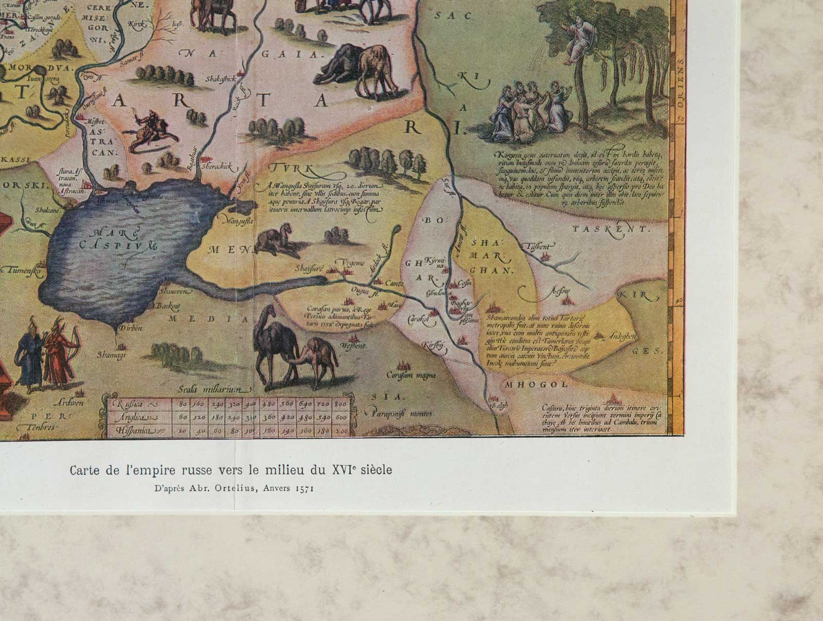 Эта великолепная цветная и информативная карта России и соседних стран в XVI веке. На ней показаны Литва, Карелия, Крым, Лапландия, Персия, Туркмения, Казакия (земля казаков), империя Моголов, Киргизия, Казахстан, Новая Земля.