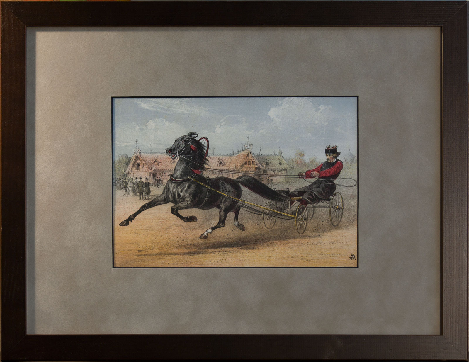 На гравюре изображен вороной жеребец Бедуин, резвость которого произвела фурор на Всемирной выставке в Париже в 1867 году. Эту выставку на Марсовом поле за полгода посетило более 9 миллионов человек.