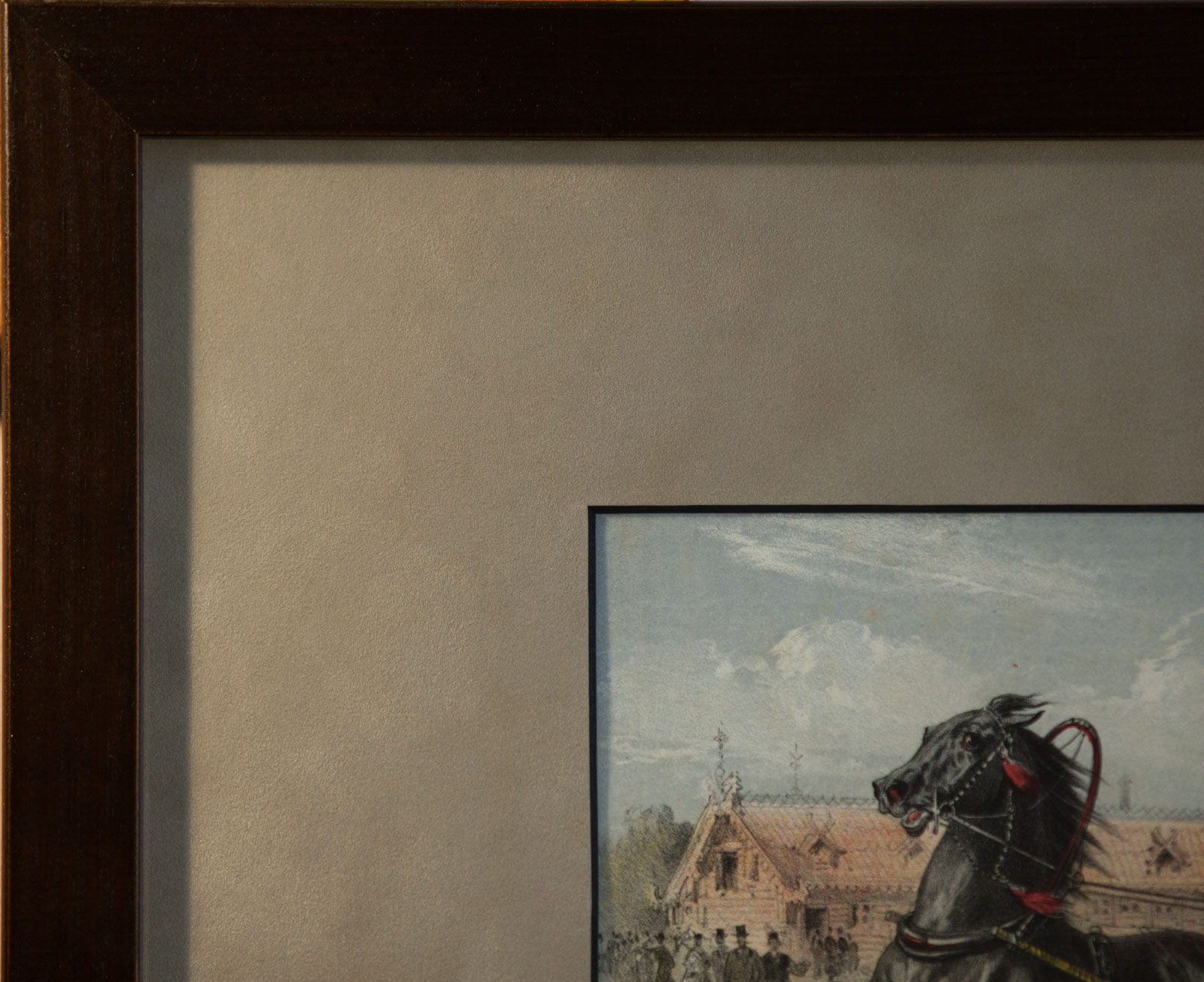 Оформлена в консервационное паспарту из светло-серого бархата. Черный срез паспарту создаёт строгое и утончённое внутреннее обрамление гравюры и выгодно подчеркивает тонкие изящные контуры благородного гнедого рысака.