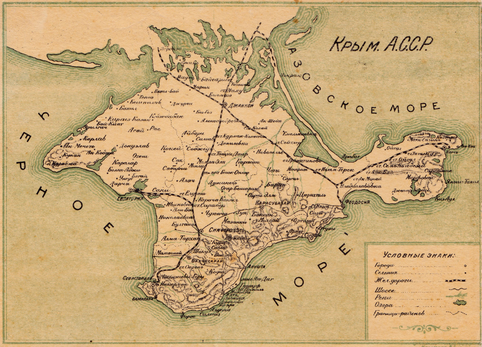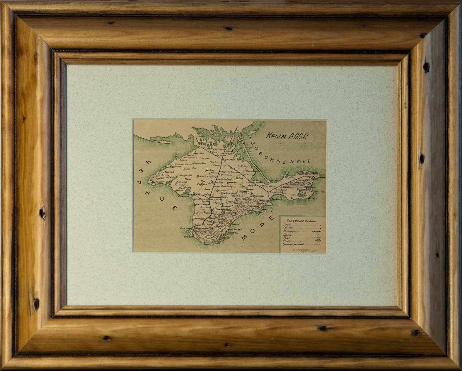 Интересно, что данная открытка была отпечатана на основе уже существовавшей ранее аналогичной почтовой карточки. В начале ХХ века (ориентировочно, в 1902-1903 годах) литографическим заведением А. Ильина в Санкт-Петербурге была издана почтовая карточка «Полуостров Крымъ». Советская почтовая открытка обогатилась большим количеством географических названий и обозначениями железных дорог, шоссе и границ районов. Добавился участок железной дороги Керчь – Владиславовка, обозначенный на карточке начала ХХ века пунктиром, и новые участки – до Евпатории и Перекопа.