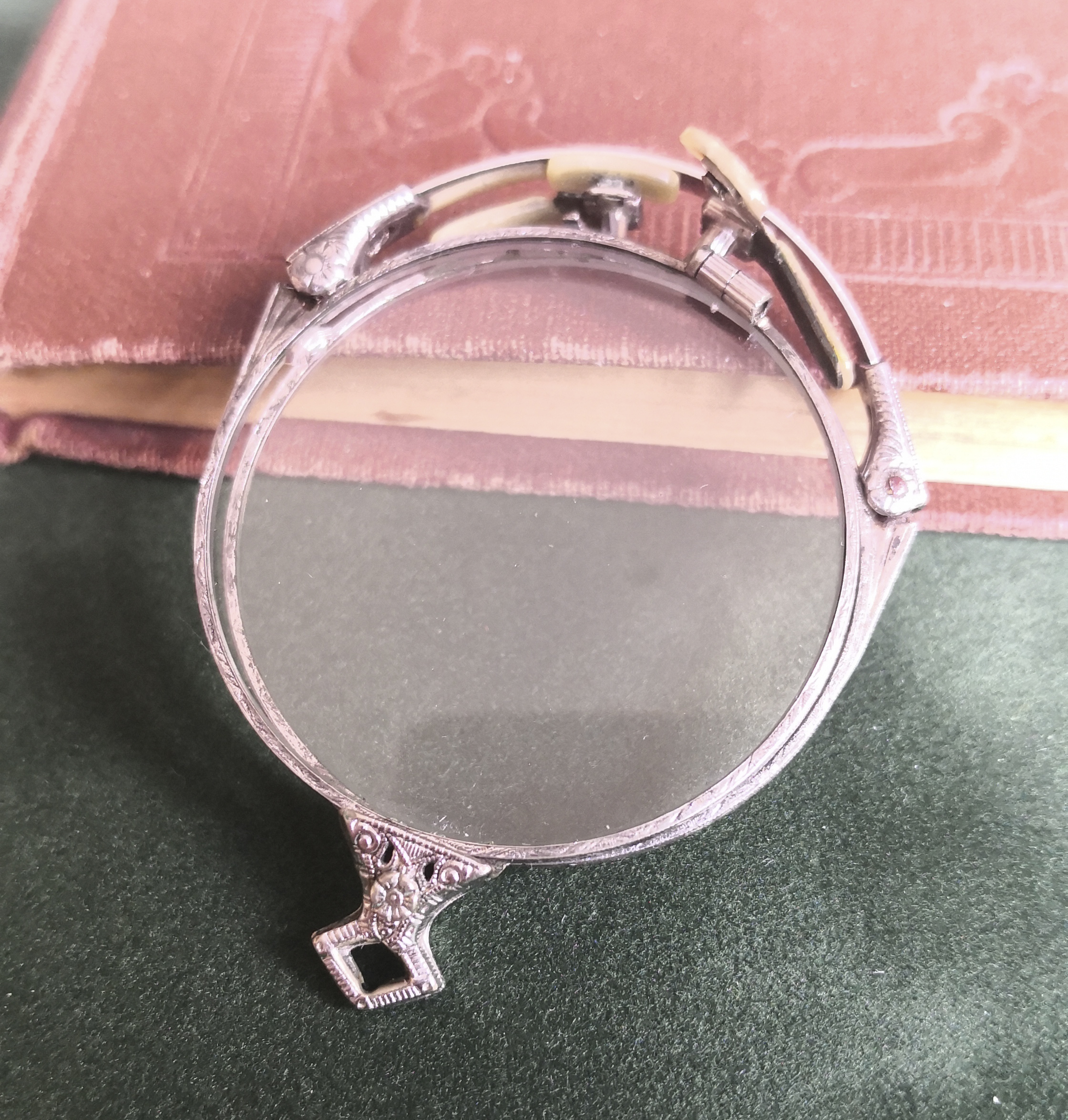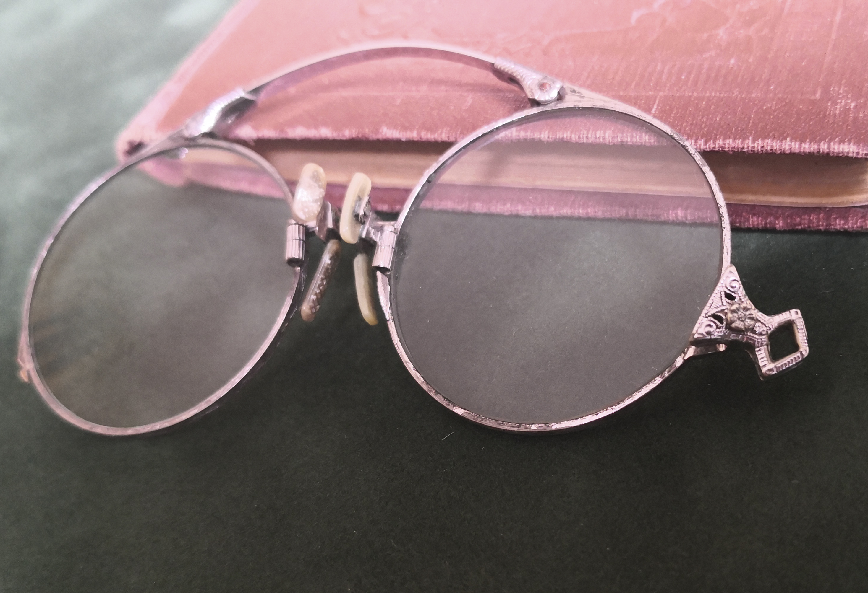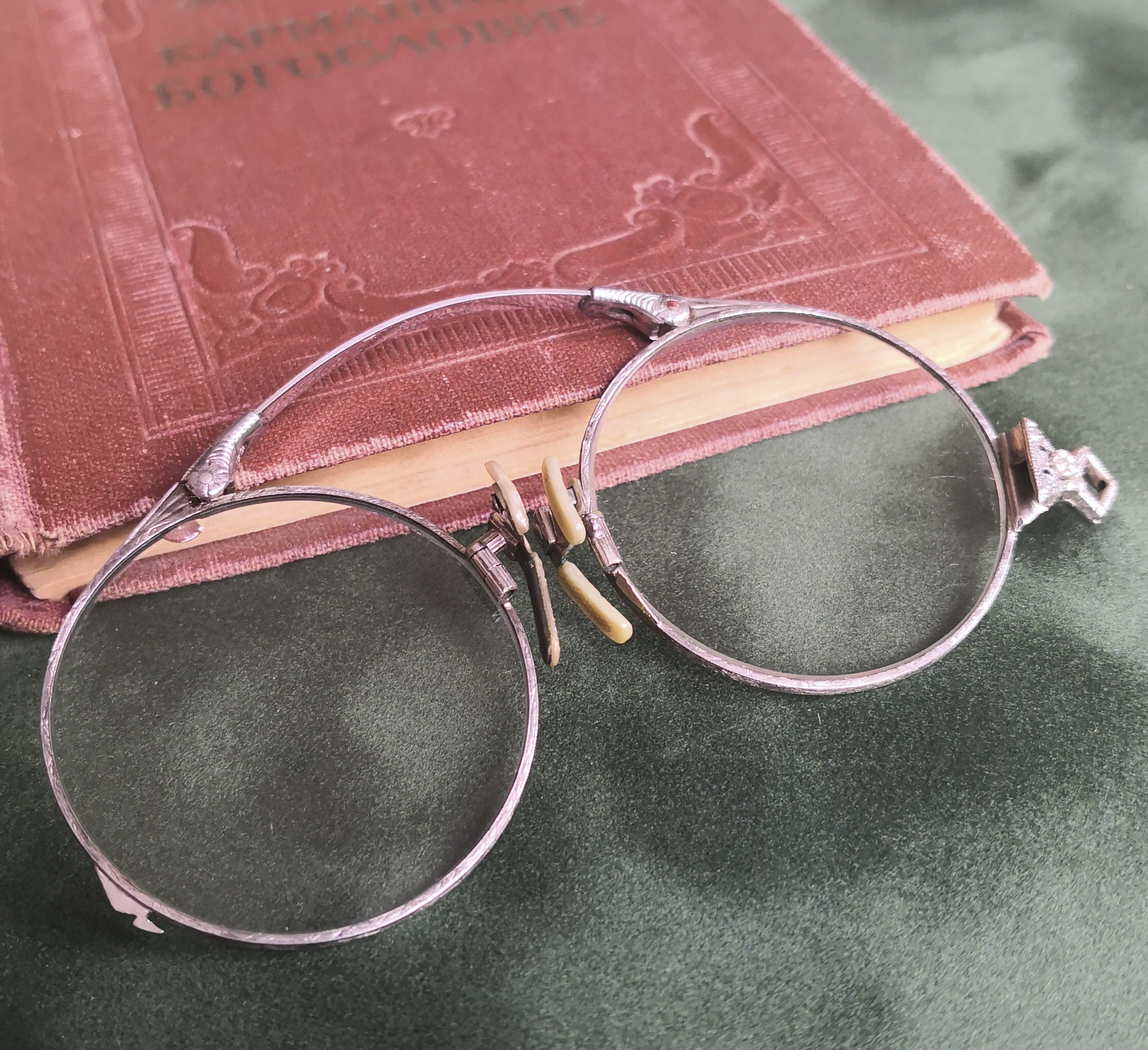 Изюминкой этой восхитительной вещицы является то, что пенсне складывается в кулон, который можно подвесить на шнурок или цепочку и носить на шее или прикрепить к карману.