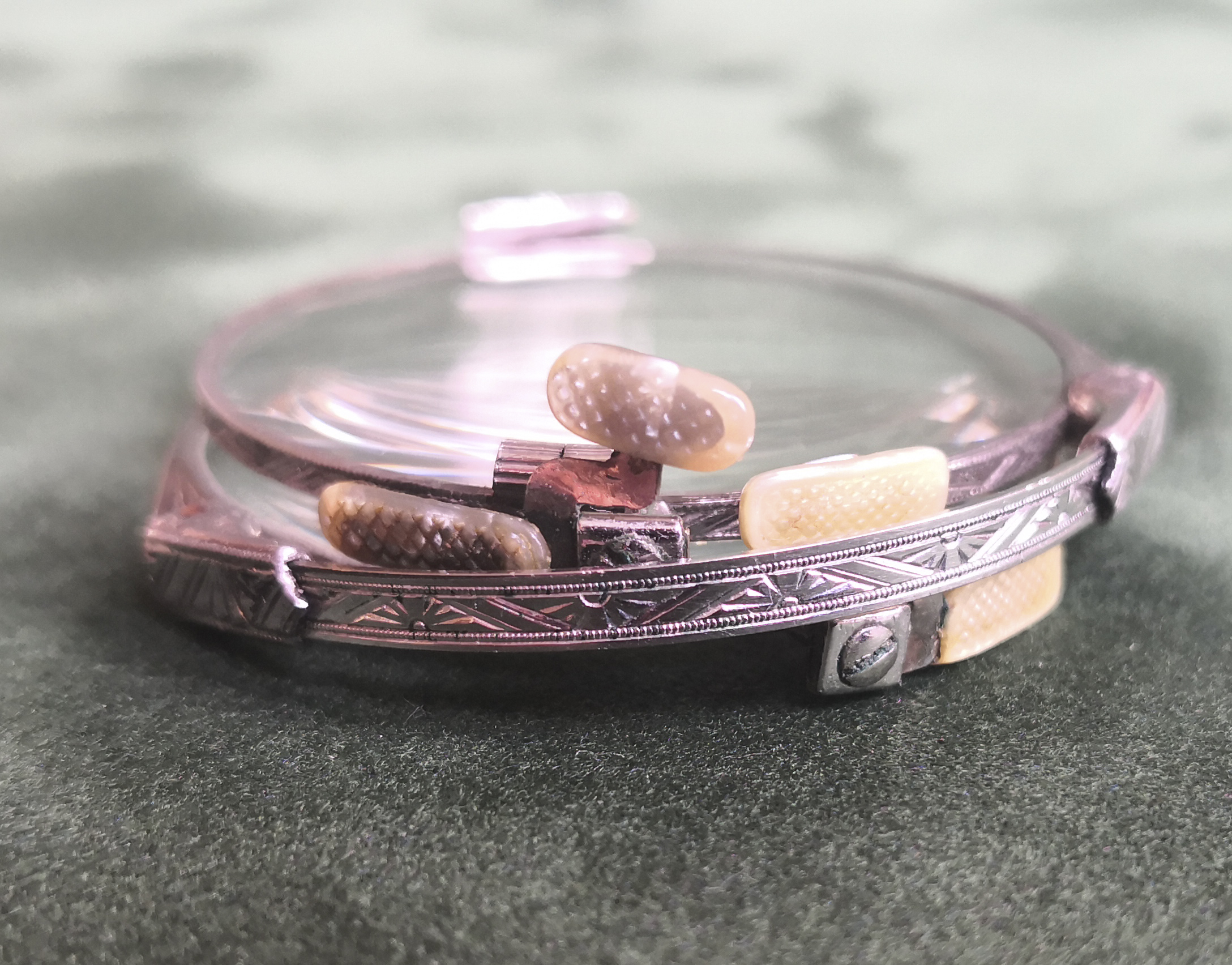Чтобы раскрыть кулон нужно сдвинуть замок-фиксатор, и с легким приятным звуком щелчка кулон развернётся в пенсне. Замок-фиксатор сделан в виде кнопки-цветочка и помещен на выступ с отверстием для цепочки.