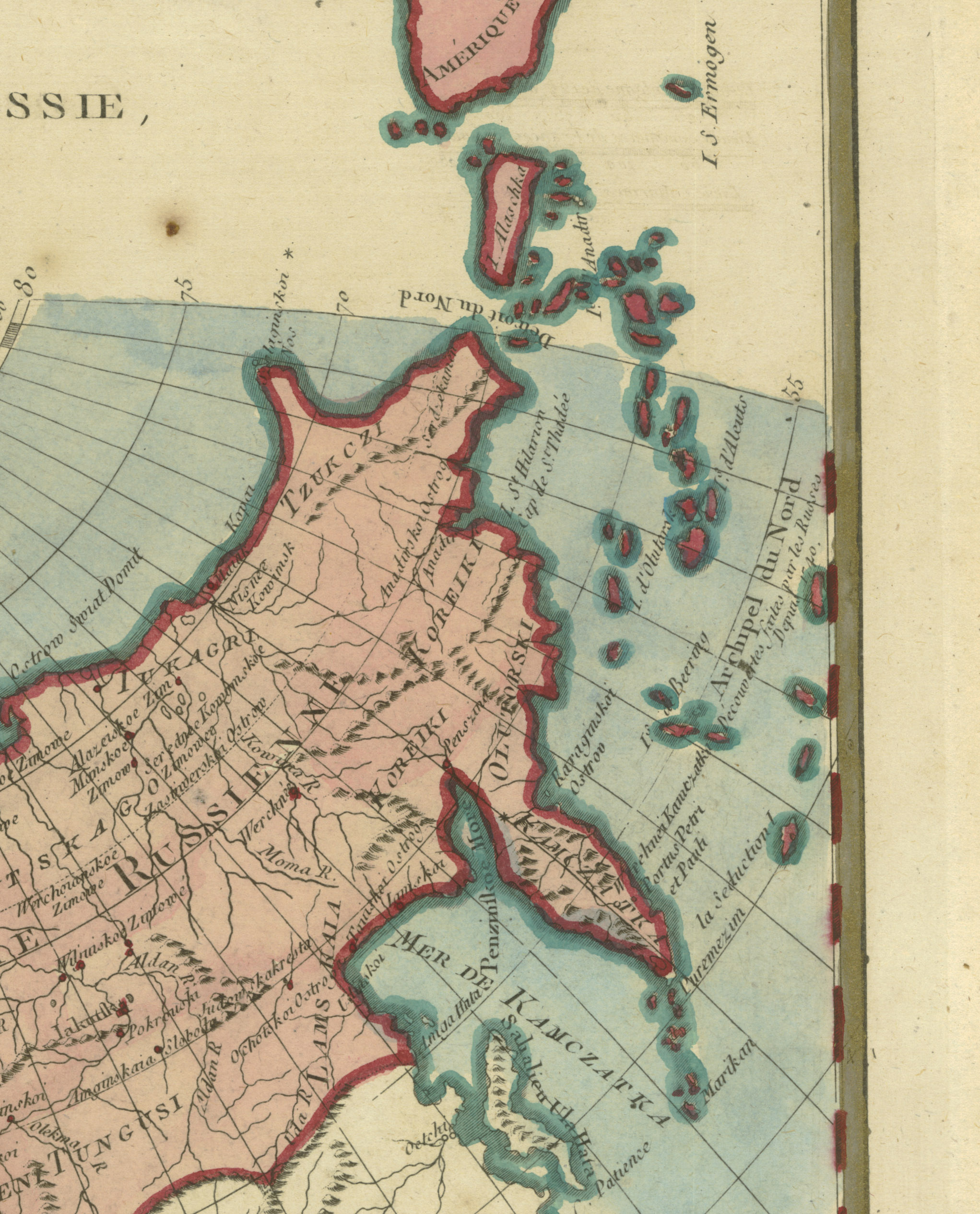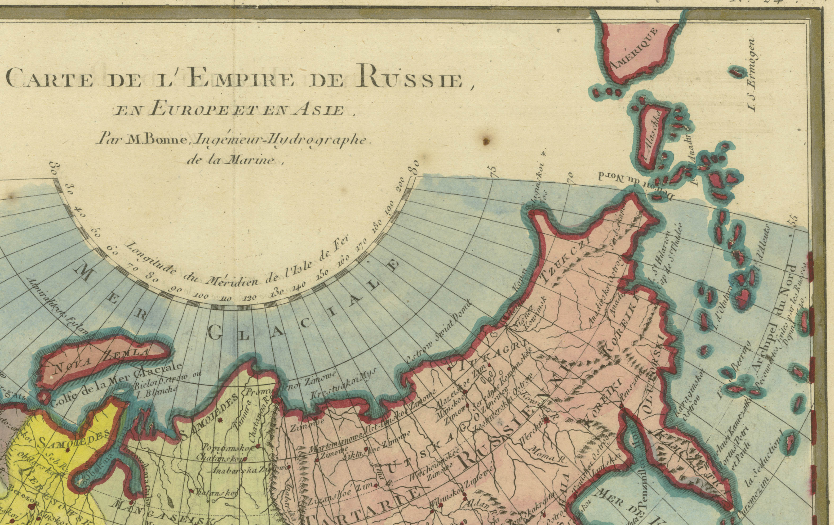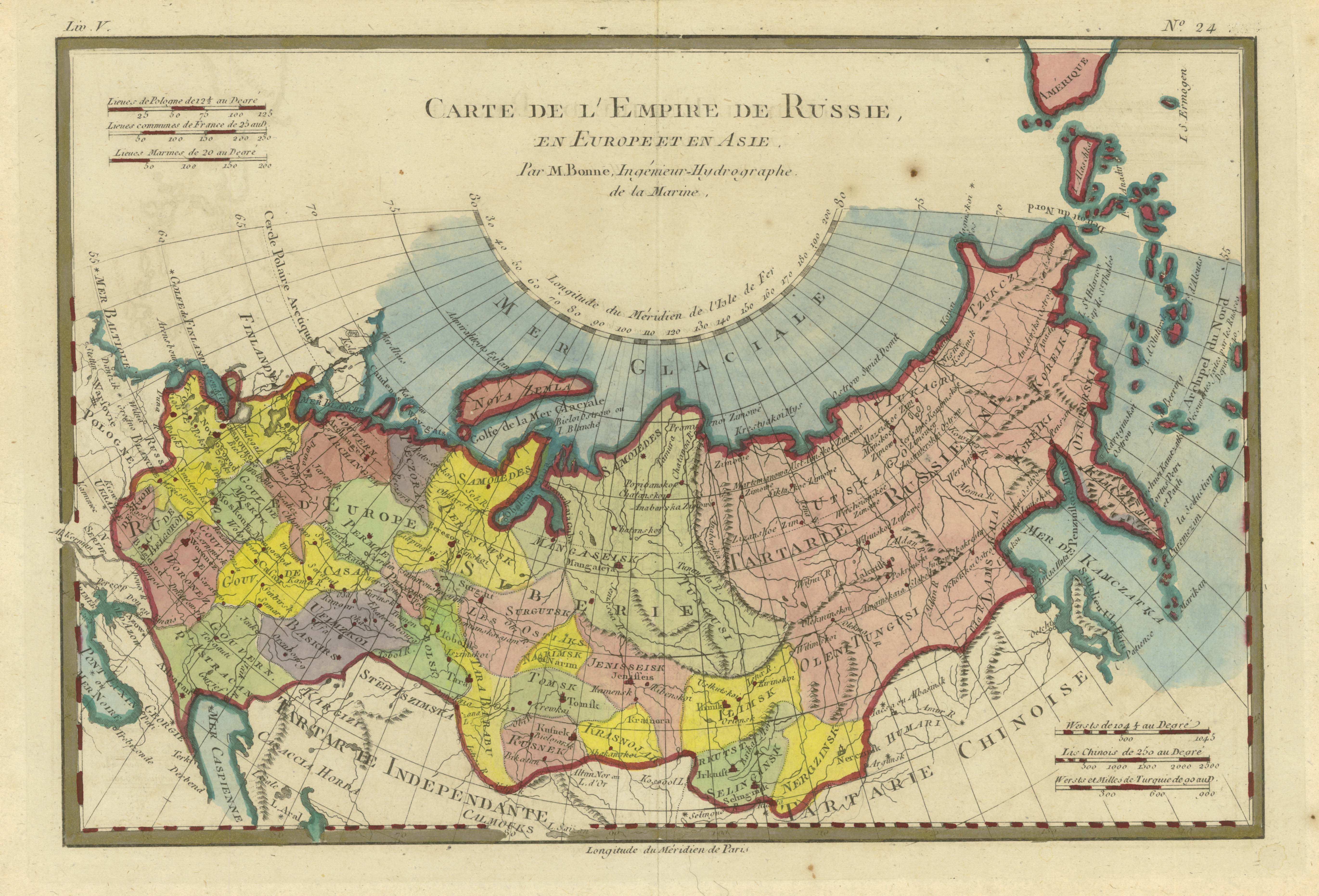 Бонне в своих картах отказался от принятых в картографии своего времени декоративных особенностей – ручной акварельной раскраски карты, художественных рисунков на полях и розы ветров. Его карты получились очень детализированными и предельно строгими. И по сей день они очень высоко ценятся специалистами за историческую значимость, присутствующую в огромном количестве подробностей. Предлагаемая карта представляет интерес как с точки зрения истории и картографии, так и с точки зрения искусства и эстетики. С точки зрения картографии северо-восточное побережье России изображено довольно точно, за исключением земель, прилегающих к Америке, которые нарисованы очень приблизительно: можно рассмотреть группу Анадырских островов и остров Аляска недалеко от Алеутских островов. Несомненно привлекательной характеристикой данного экземпляра является то, что отпечатан он на бумаге «верже», и эта «полосатость» хорошо заметна, придает карте известную элегантность. Бумага плотная, но очень изящной выделки. Карта отлично сохранилась, выглядит прекрасно для своего возраста и может послужить как стильным украшением рабочего кабинета, так и достойным экземпляром для коллекции. Карта приехала в нашу коллекцию из Польши.Состояние карты и оформление