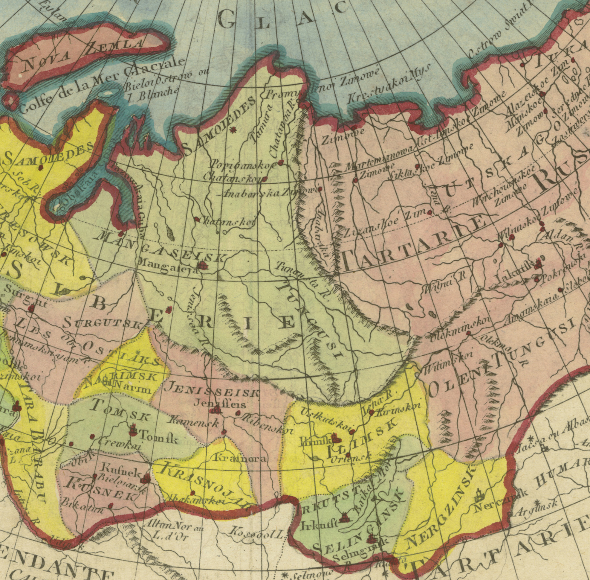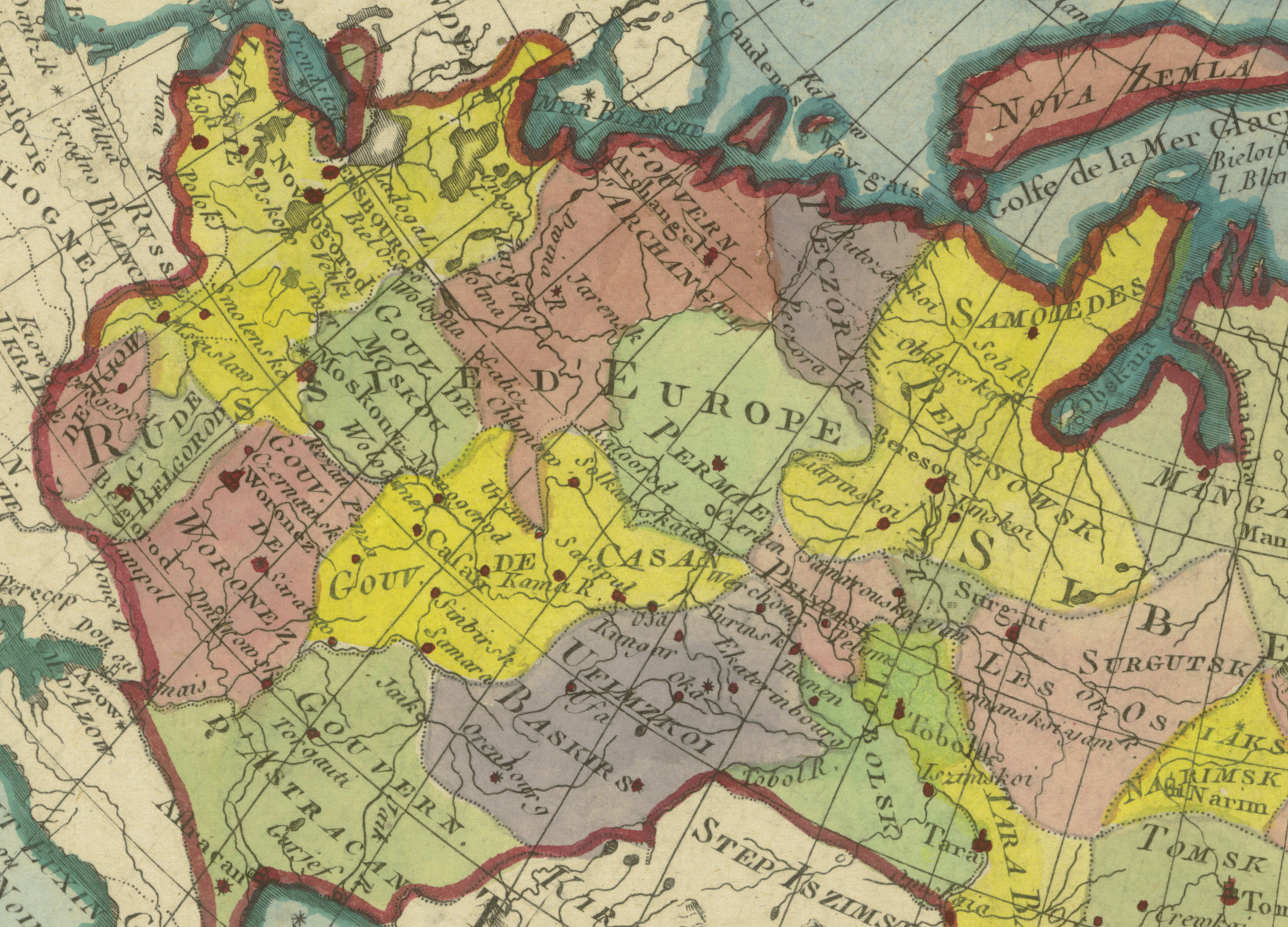 Изумительный экземпляр карты Российской империи 2-ой половины XVIII века. Карта отображает фактически всю Российскую Империю, простирающуюся от Европы до Аляски. Сравнивая ее с другими картами Российской империи, необходимо особо отметить, что она обладает впечатляющей детализацией: на ней города, реки, административное деление губерний, указаны временные поселения (зимовья) и названия народностей. Среди народов, населяющих Российскую империю, на карте легко находятся башкиры, чукчи, ханты (ostiaks), тунгусы, каряки, самоеды (samoiedes).