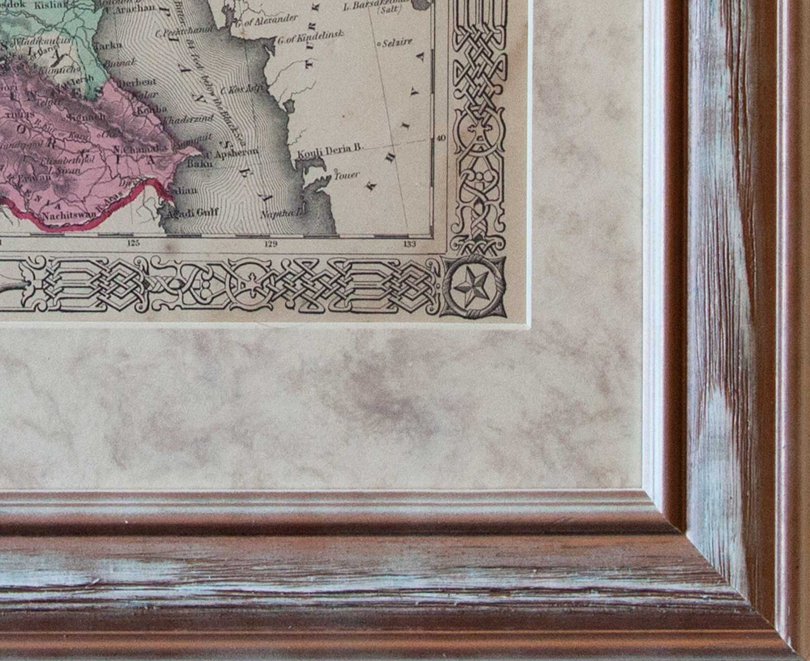 Карта оформлена в паспарту с легким цветовым оттенком в тон фону карты и обрамлена в деревянную раму, под стекло. Стыки между рамой и паспарту проклеены пылезащитной лентой, задник также закрыт от пыли специальным картоном. Оборотная сторона рамы снабжена подвесом из проволоки с прозрачным пластиковым покрытием, приятным на ощупь.
