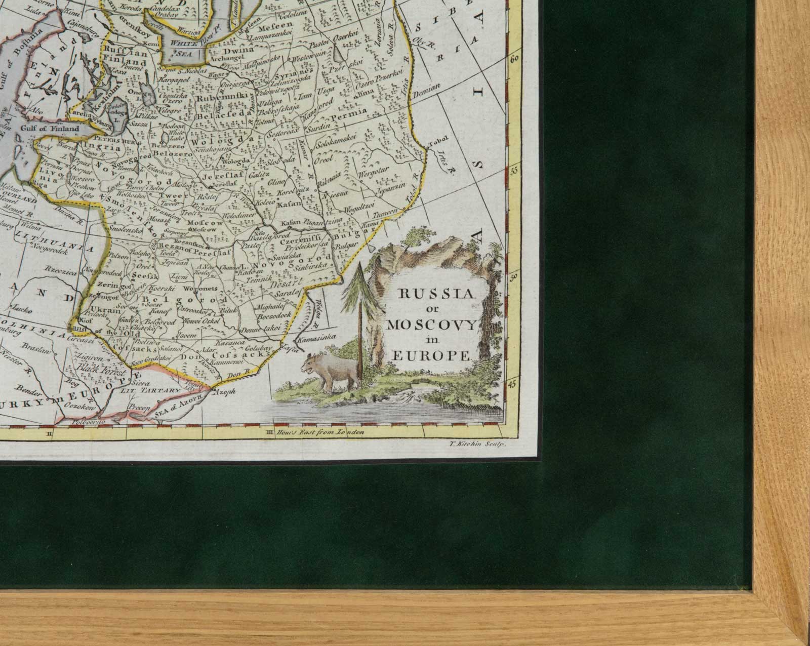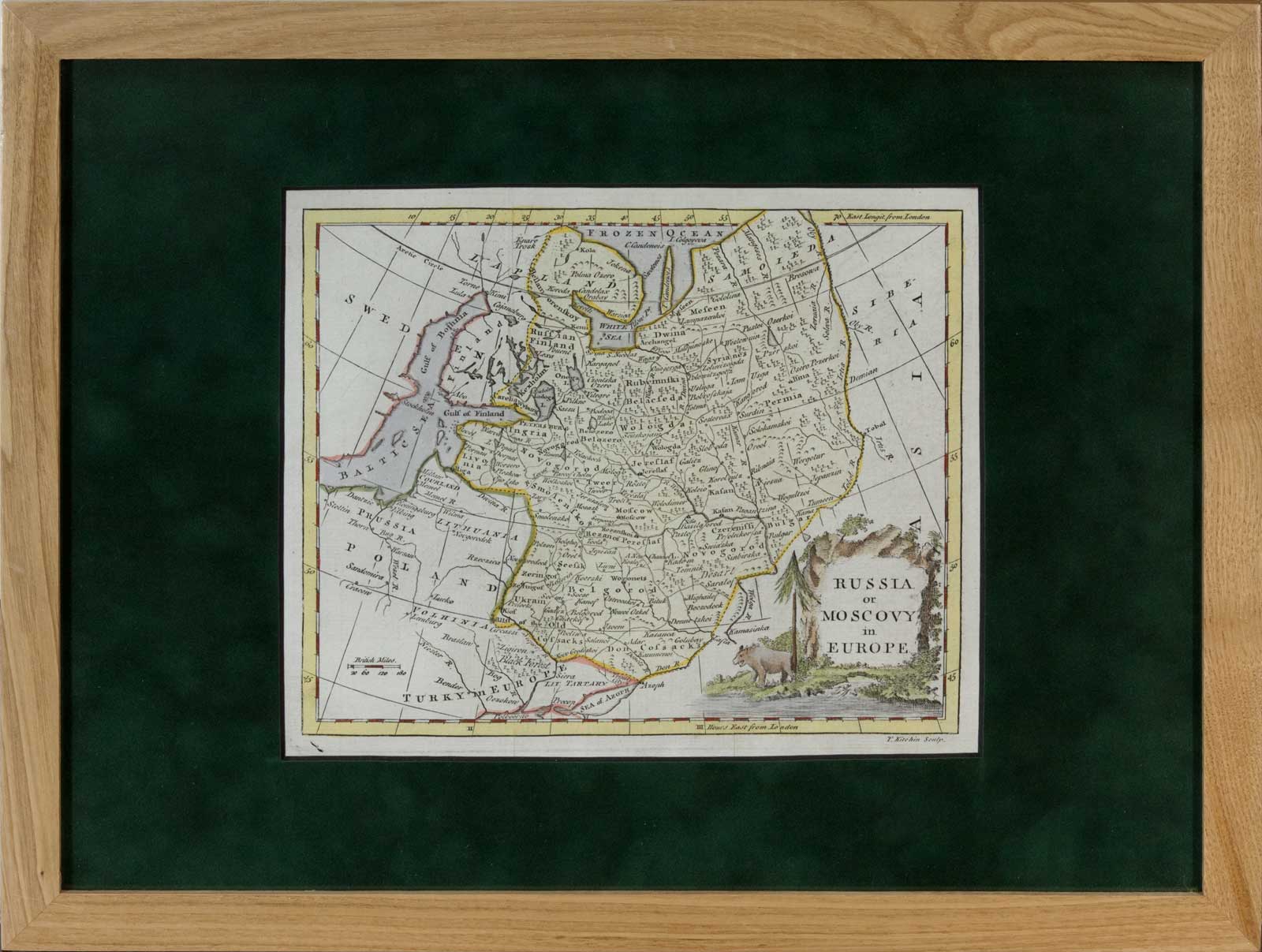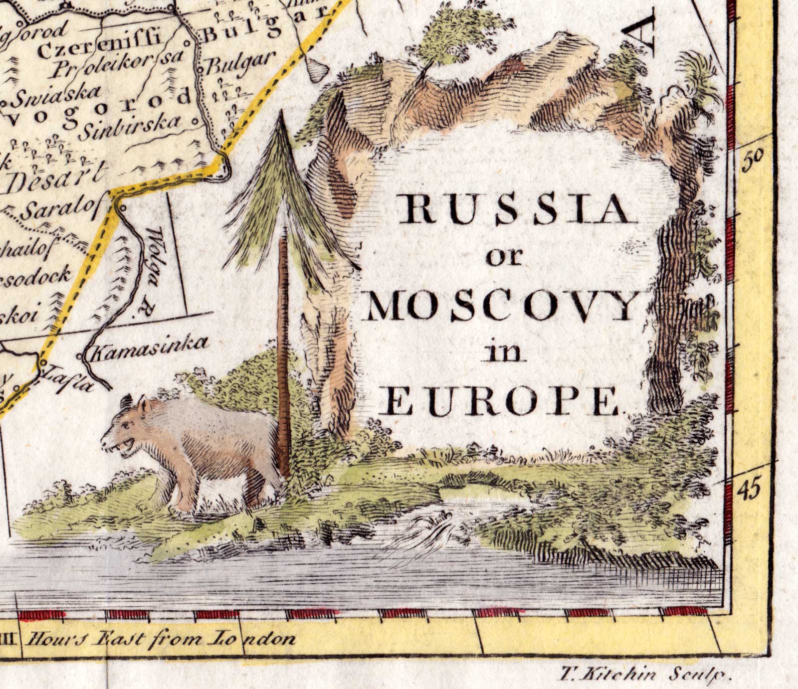 Замечательным украшением этой антикварной карты второй половины XVIII века является цветной картуш со стилизованным изображением медведя на фоне гор, реки и леса – незабываемая ассоциация с далёкой Россией. Медведь наиболее часто присутствует в карманных изданиях карт России (Московии). Вероятно, не все художники-гравёры видели это животное воочию, потому что изображается он по-разному и не всегда похож на привычного нам бурого медведя. Однако, для знакомства публики с типичным животным далёких московитских земель страшный зверь с картинки вполне подходил.