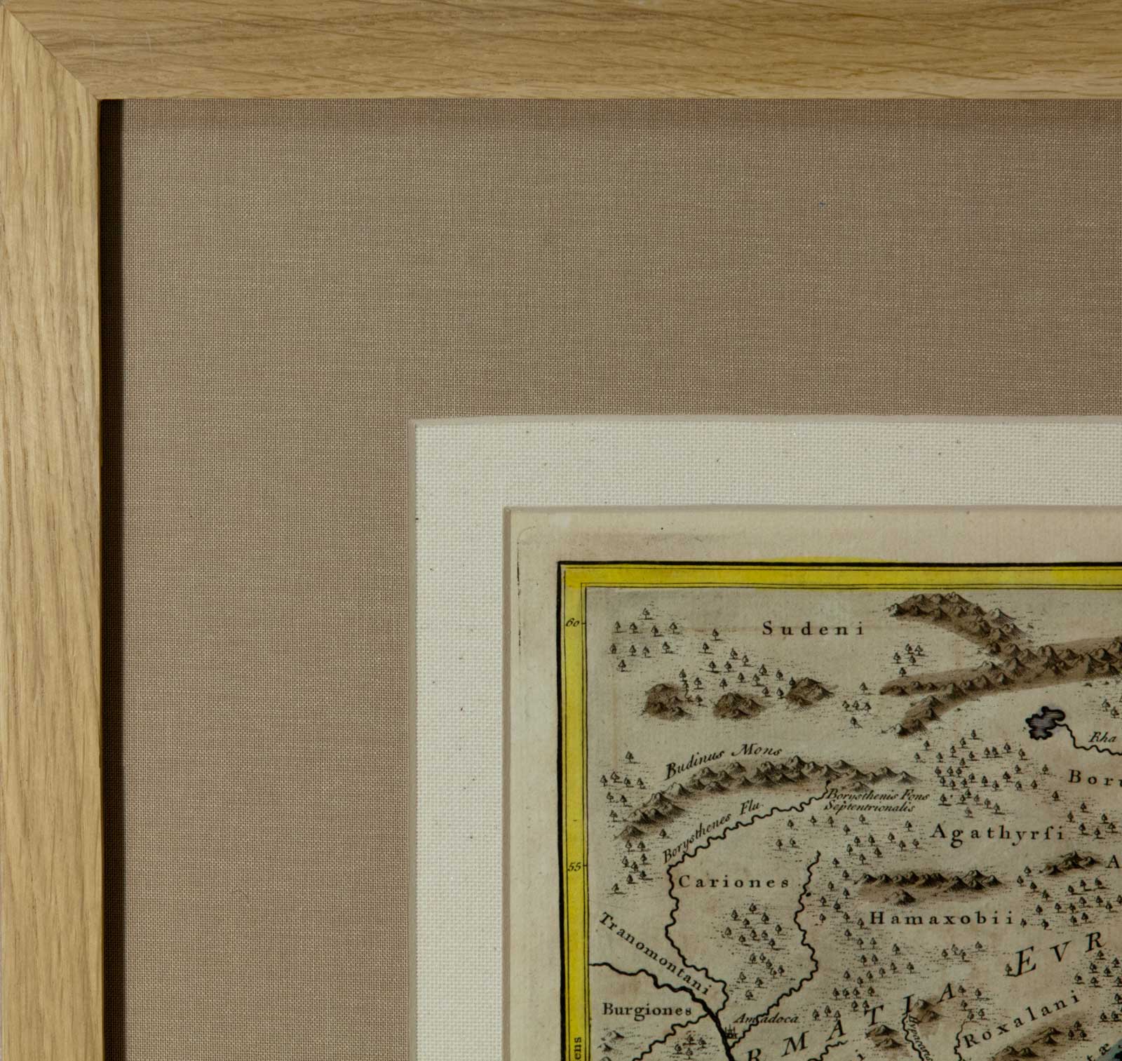 Карта в очень хорошей сохранности, оформлена в двойное паспарту консервационного качества. Материал паспарту – лён двух различных оттенков.