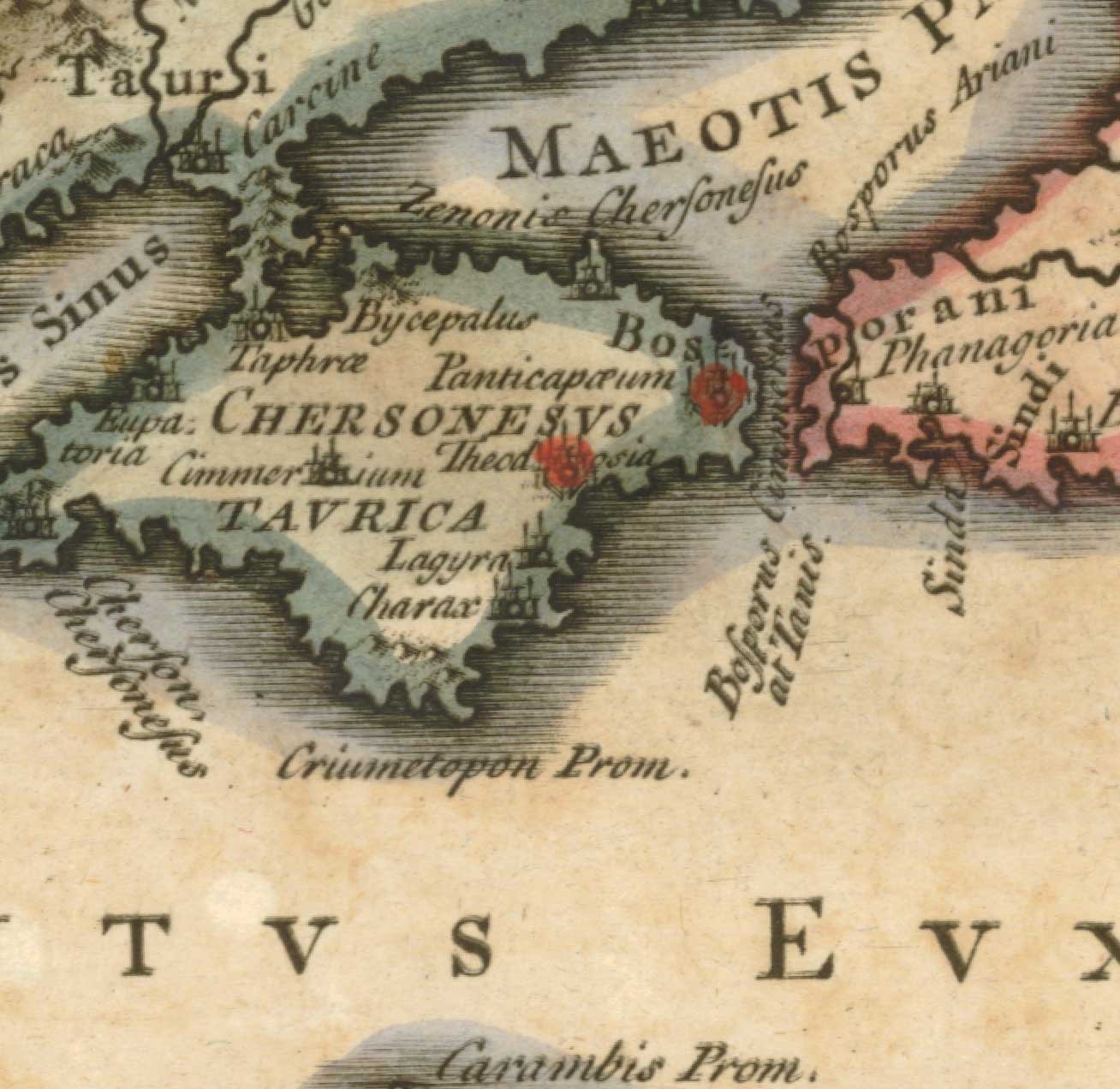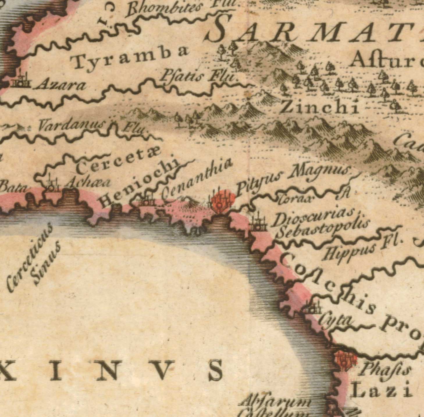 Наиболее крупные и значимые для своего времени города выделены и подкрашены красной акварелью: Panticapaeum (Пантикапей – современная Керчь), Theodosia (Феодосия), Pityus Magnus (Пицунда), Phasis (Фасис, теперь это город Поти), Trapezus (Трапезунд).