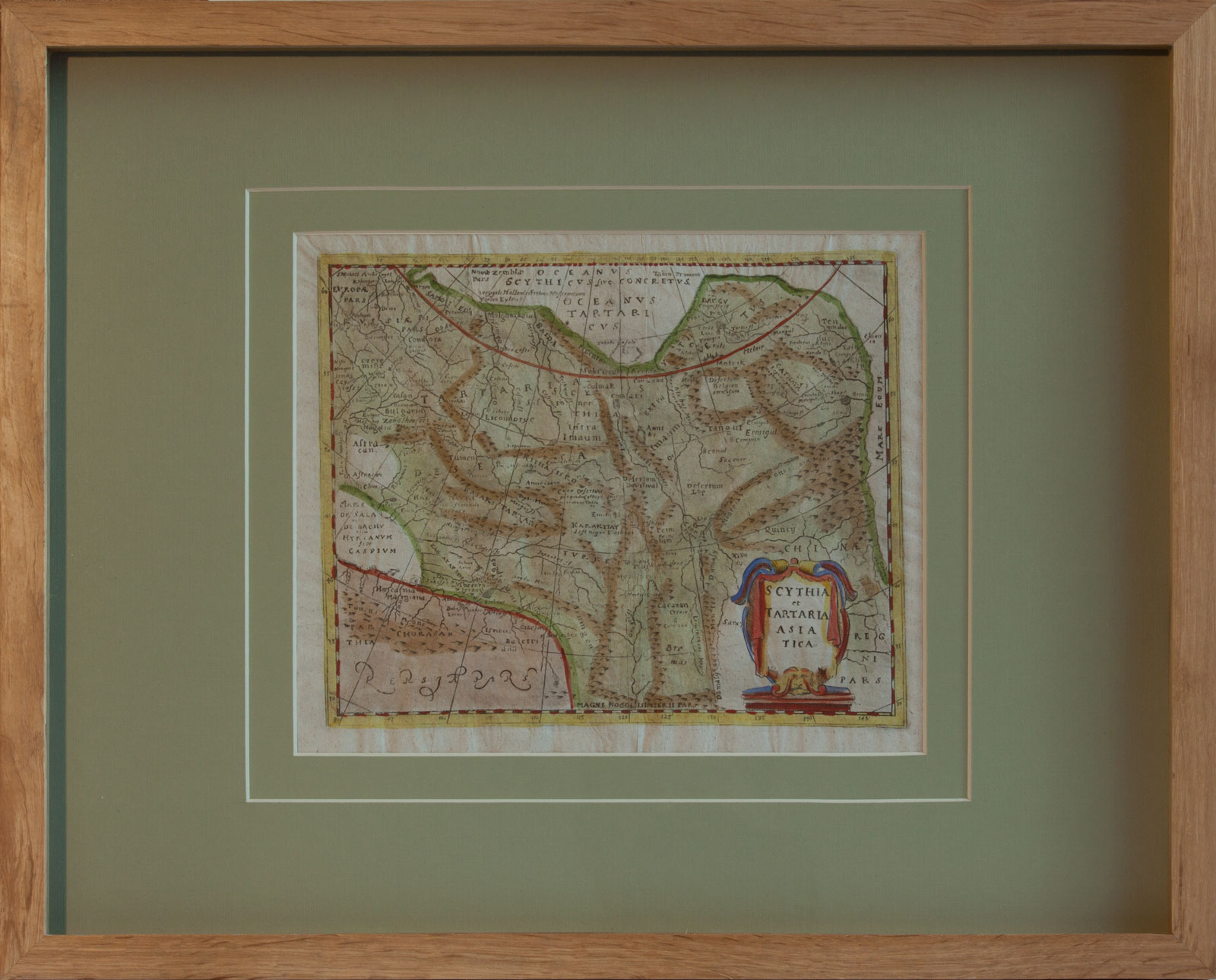 Карта обрамлена в глубокую дубовую раму, придающую внутренний объём экспозиции старинной гравюры.