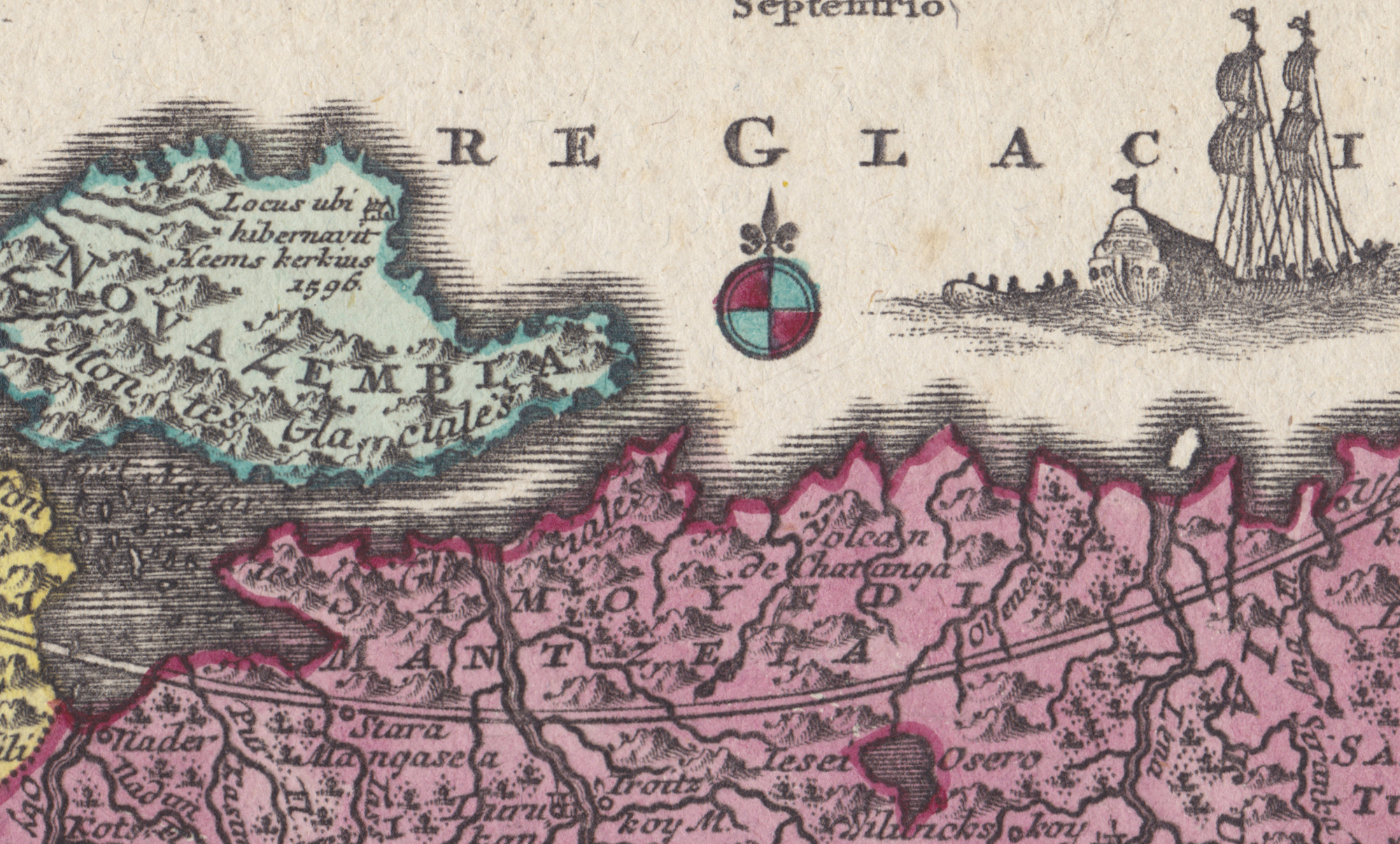 Обратите внимание на надпись-комментарий на Новой Земле: «Место, где зимовал Хемскерк». Экспедиция Баренца, в которой участвовал Якоб Ван Хемскерк, обогнув Новую Землю, достигла Карского моря. Опасаясь гибели среди льдов, экспедиция высадилась на берег и устроила зимовку на Новой Земле близ Ледяной Гавани. Баренц погиб, а Хемскерк вернулся в Голландию. Историю пишут победители: имя Хемскерка - на карте, а Баренц… Ну подумаешь, начальник экспедиции!